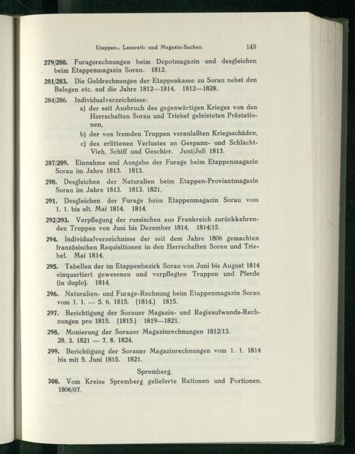 281/283, Die Geldrechnungen der Etappenkasse zu Sorau nebst den Belegen etc, auf die Jahre 1812—1814, 1812—1828, 284/286. Individualverzeichnisse: