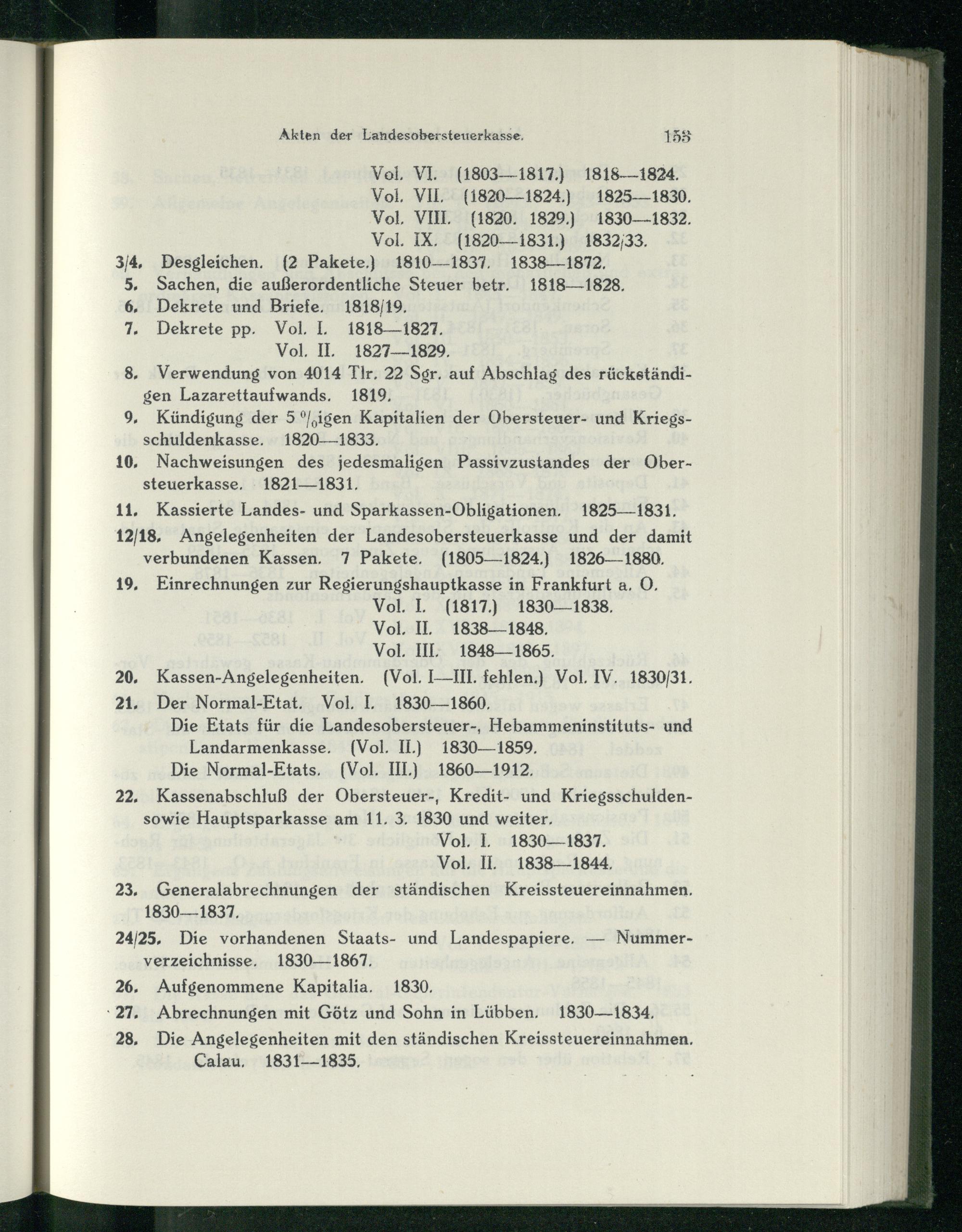 19, Einrechnungen zur Regierungshauptkasse in Frankfurt a. O. Vol. IL.(1817.) 1830—1838, Vol. ILL. 1838—1848, Vol. IIL_. 1848—1865. 20, Kassen-Angelegenheiten.(Vol. I—1II. fehlen.) Vol, IV. 1830/31. 21, Der Normal-Etat. Vol. I, 1830—1860, Die Etats für die Landesobersteuer-, Hebammeninstituts- und Landarmenkasse.(Vol. II.) 1830-—1859, Die Normal-Etats,(Vol. III) 1860—1912, 22. Kassenabschluß der Obersteuer-, Kredit- und Kriegsschuldensowie Hauptsparkasse am 11. 3. 1830 und weiter, Vol. IL. 1830—1837. Vol. ILL. 1838—1844,