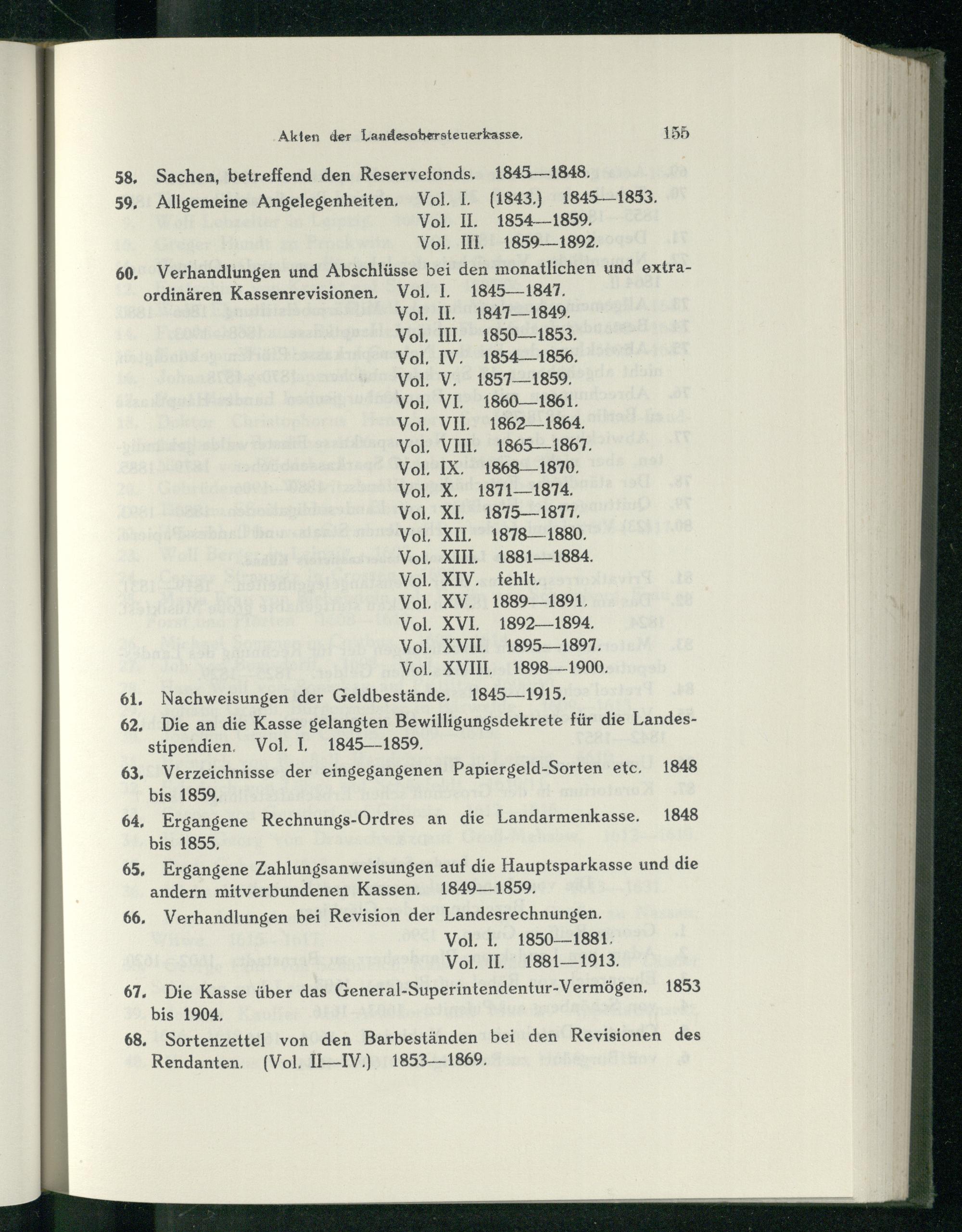 66, Verhandlungen bei Revision der Landesrechnungen, Vol. I. 1850—1881. Vol, IL 1881—1913. 67. Die Kasse über das General-Superintendentur-Vermögen, 1853 bis 1904,