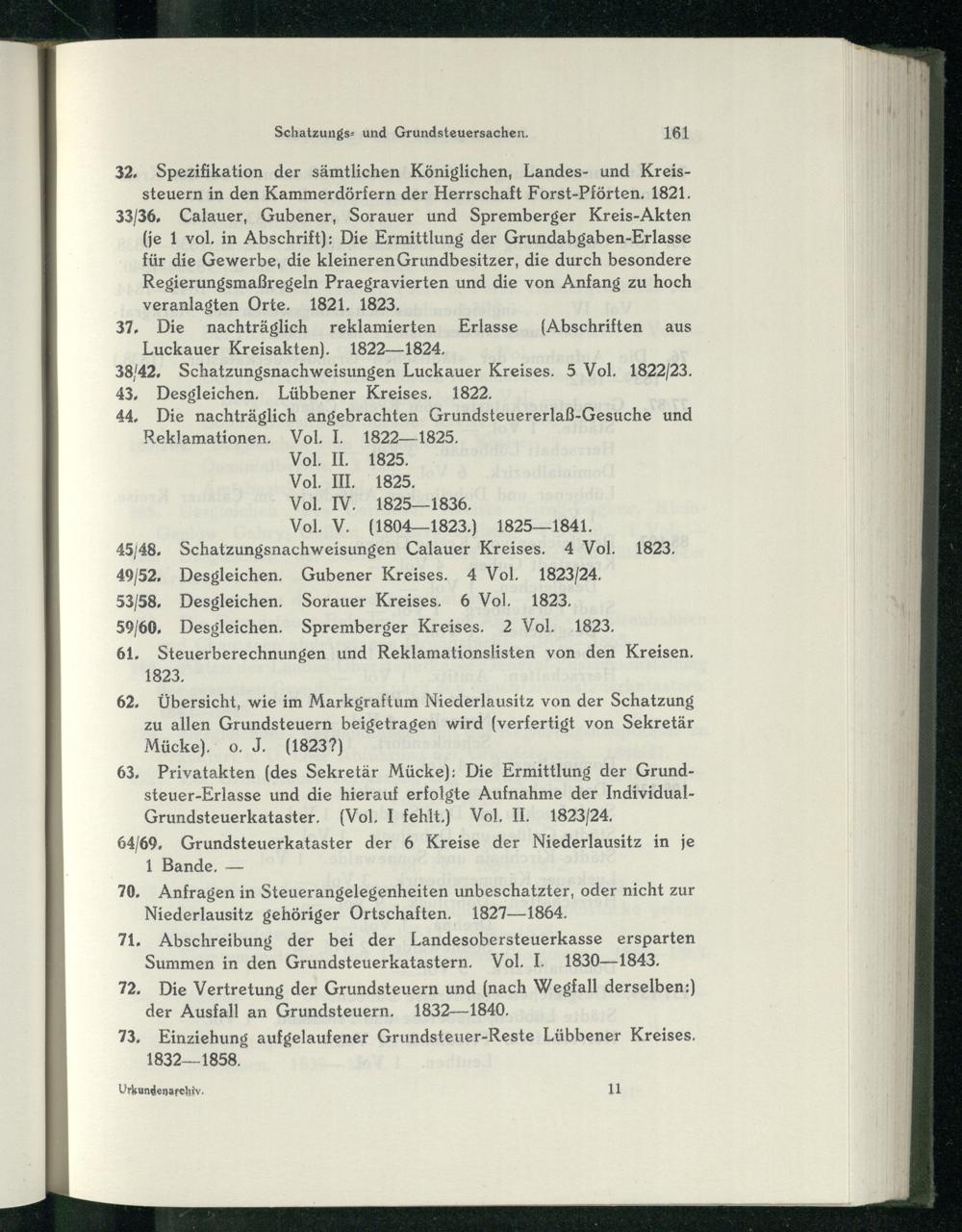 Vol. V.(1804—1823,.) 1825—1841. Schatzungsnachweisungen Calauer Kreises, 4 Vol. 1823, Desgleichen. Gubener Kreises. 4 Vol, 1823/24. Desgleichen. Sorauer Kreises. 6 Vol. 1823,