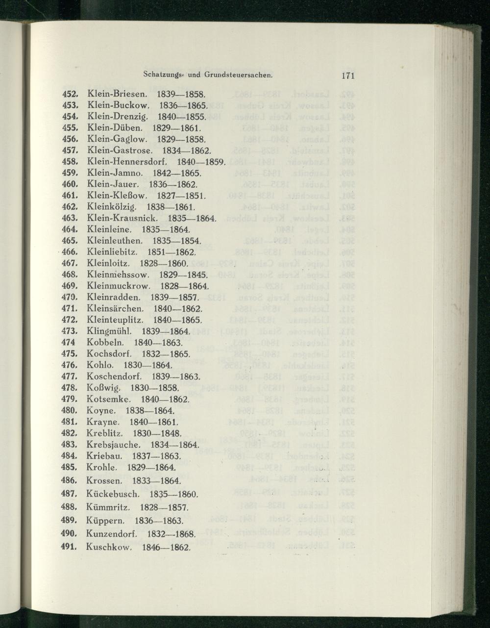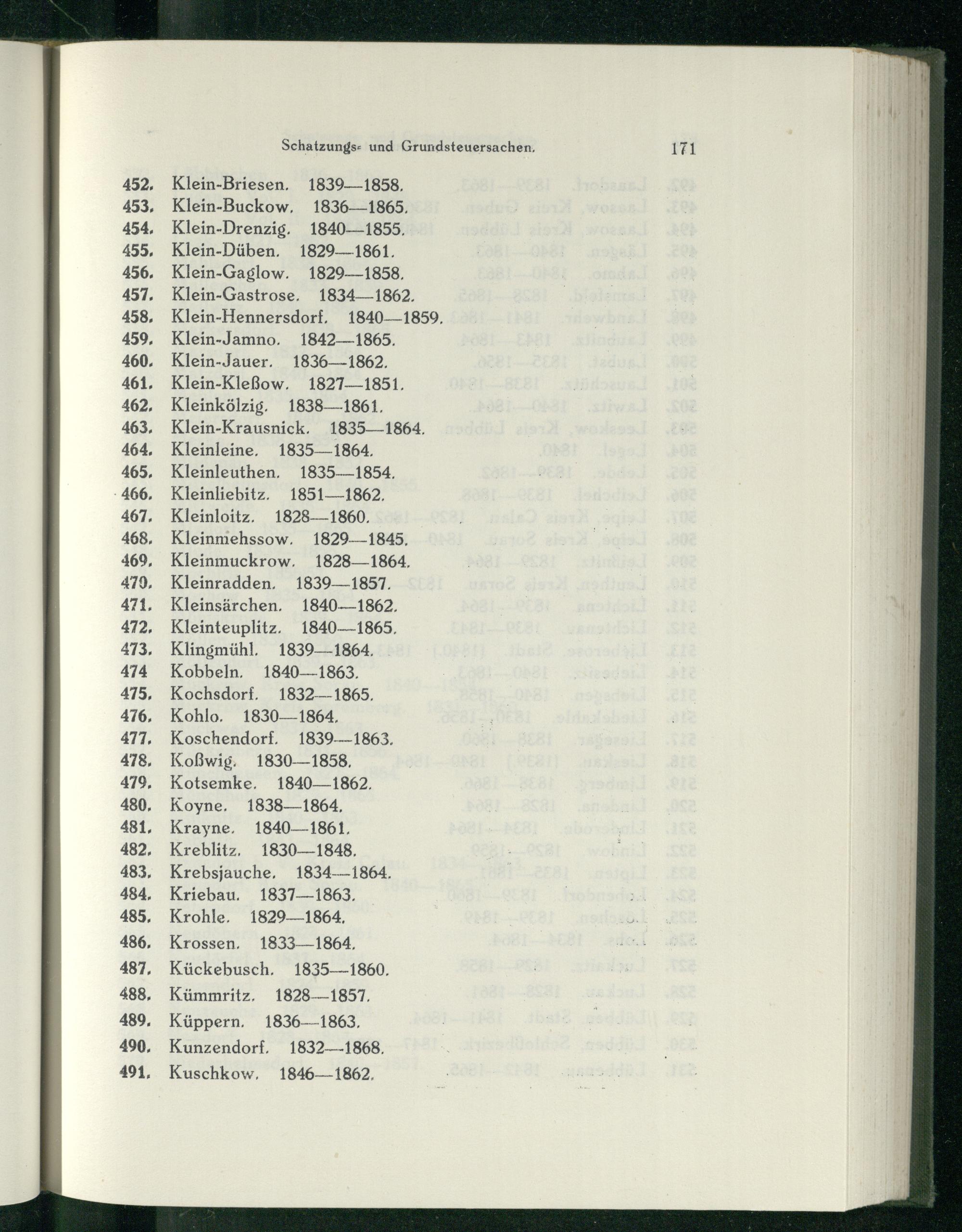 Klein-Briesen. 1839-—1858, Klein-Buckow, 1836—1865. Klein-Drenzig. 1840-—1855, Klein-Düben. 1829-1861. Klein-Gaglow. 1829-—1858, Klein-Gastrose. 1834—1862. Klein-Hennersdorf, 1840—1859, Klein-Jamno. 1842—1865. Klein-Jauer. 1836—- 1862. Klein-Kleßow., 1827-—1851. Kleinkölzig. 1838—1861. Klein-Krausnick , 1835—1864. Kleinleine, 1835-—1864. Kleinleuthen, 1835-—1854, Kleinliebitz. 1851—1862. Kleinloitz, 1828-—1860. Kleinmehssow. 1829-—1845, Kleinmuckrow. 1828—1864. Kleinradden, 1839—1857. Kleinsärchen. 1840-—1862, Kleinteuplitz. 1840-—1865, Klingmühl, 1839—1864. Kobbeln. 1840-—1863, Kochsdorf. 1832-—- 1865, Kohlo. 1830—1864, Koschendorf. 1839-1863, Koßwig. 1830—1858, Kotsemke. 1840—1862, Koyne, 1838—1864, Krayne, 1840—1861., Kreblitz, 1830—1848, Krebsjauche, 1834-—1864, Kriebau. 1837—1863, Krohle, 1829—1864,