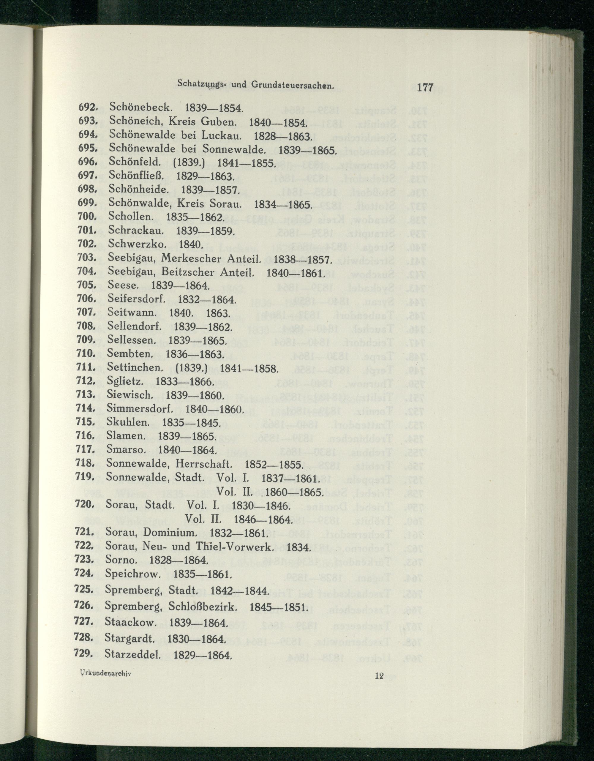 Schönebeck , 1839—1854, Schöneich, Kreis Guben, 1840—1854. Schönewalde bei Luckau . 1828—1863. Schönewalde bei Sonnewalde . 1839—1865. Schönfeld.(1839) 1841—1855, Schönfließ. 1829—1863. Schönheide , 1839—1857, Schönwalde, Kreis Sorau . 1834—1865. Schollen. 1835—1862. Schrackau, 1839—1859, Schwerzko, 1840. Seebigau, Merkescher Anteil, 1838—1857. Seebigau, Beitzscher Anteil, 1840—1861. Seese. 1839—1864. Seifersdorf, 1832—1864. Seitwann. 1840. 1863. Sellendorf, 1839—1862. Sellessen . 1839-—1865. Sembten. 1836—1863. Settinchen.(1839.) 1841—1858, Sglietz. 1833-—1866. Siewisch. 1839—1860. Simmersdorf, 1840—1860. Skuhlen, 1835—1845, Slamen. 1839—1865. Smarso, 1840—1864. Sonnewalde , Herrschaft, 1852—1855, Sonnewalde , Stadt. Vol. I. 1837—1861. Vol, ILL. 1860—1865.