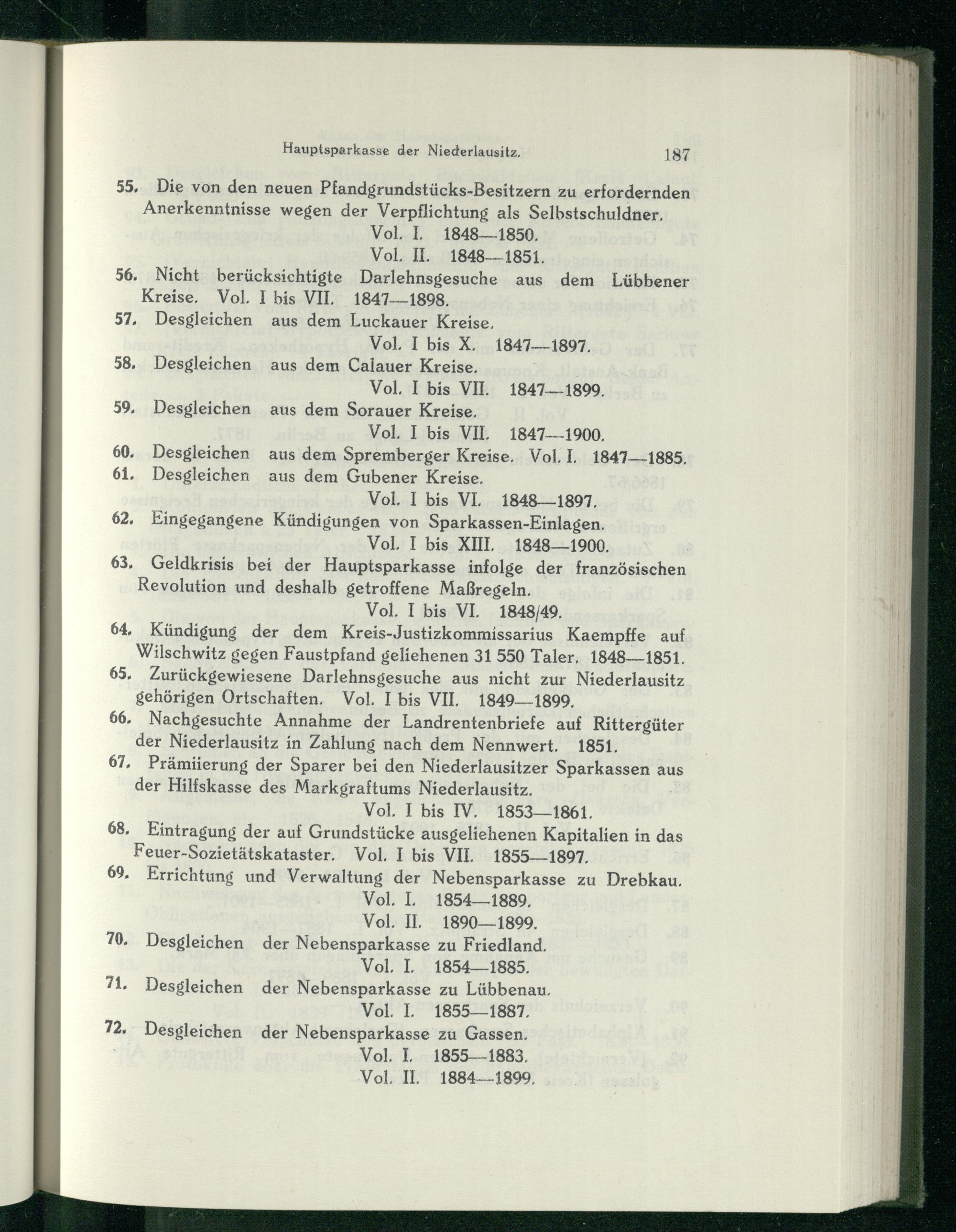 55, Die von den neuen Pfandgrundstücks-Besitzern zu erfordernden Anerkenntnisse wegen der Verpflichtung als Selbstschuldner, Vol. I. 1848— 1850, Vol, II. 1848-1851, 56. Nicht berücksichtigte Darlehnsgesuche aus dem Lübbener Kreise, Vol, I bis, VIE. 1847-1898, 57, Desgleichen aus dem Luckauer Kreise, Vol. I bis X, 1847—1897, Desgleichen aus dem Calauer Kreise. Vol. I bis VII. 1847-1899, Desgleichen aus dem Sorauer Kreise, Vol. I bis VIL 1847-1900, Desgleichen aus dem Spremberger Kreise, Vol‚I. 1847——1885. 61. Desgleichen aus dem Gubener Kreise. Vol. I bis VL. 1848—1897, 62. Eingegangene Kündigungen von Sparkassen-Einlagen. Vol. I bis XIII, 1848—1900, 63, Geldkrisis bei der Hauptsparkasse infolge der französischen Revolution und deshalb getroffene Maßregeln, Vol. I bis VI, 1848/49. 64, Kündigung der dem Kreis-Justizkommissarius Kaempffe auf Wilschwitz gegen Faustpfand geliehenen 31 550 Taler, 1848-1851, 65, Zurückgewiesene Darlehnsgesuche aus nicht zur Niederlausitz gehörigen Ortschaften. Vol. I bis VII, 1849-1899, 66, Nachgesuchte Annahme der Landrentenbriefe auf Rittergüter der Niederlausitz in Zahlung nach dem Nennwert. 1851, 67, Prämiierung der Sparer bei den Niederlausitzer Sparkassen aus der Hilfskasse des Markgraftums Niederlausitz. ; Vol. I bis IV, 1853—1861. 68, Eintragung der auf Grundstücke ausgeliehenen Kapitalien in das Feuer-Sozietätskataster. Vol. I bis VII. 1855—1897. 69, Errichtung und Verwaltung der Nebensparkasse zu Drebkau . Vol. I, 1854—1889, Vol. II. 1890—1899, 70. Desgleichen der Nebensparkasse zu Friedland . Vol. I. 1854—1885. 71. Desgleichen der Nebensparkasse zu Lübbenau , Vol/L 185521887 72, Desgleichen der Nebensparkasse zu Gassen. Vol, I... 1855—1883, Vol, II, 1884-—18909,