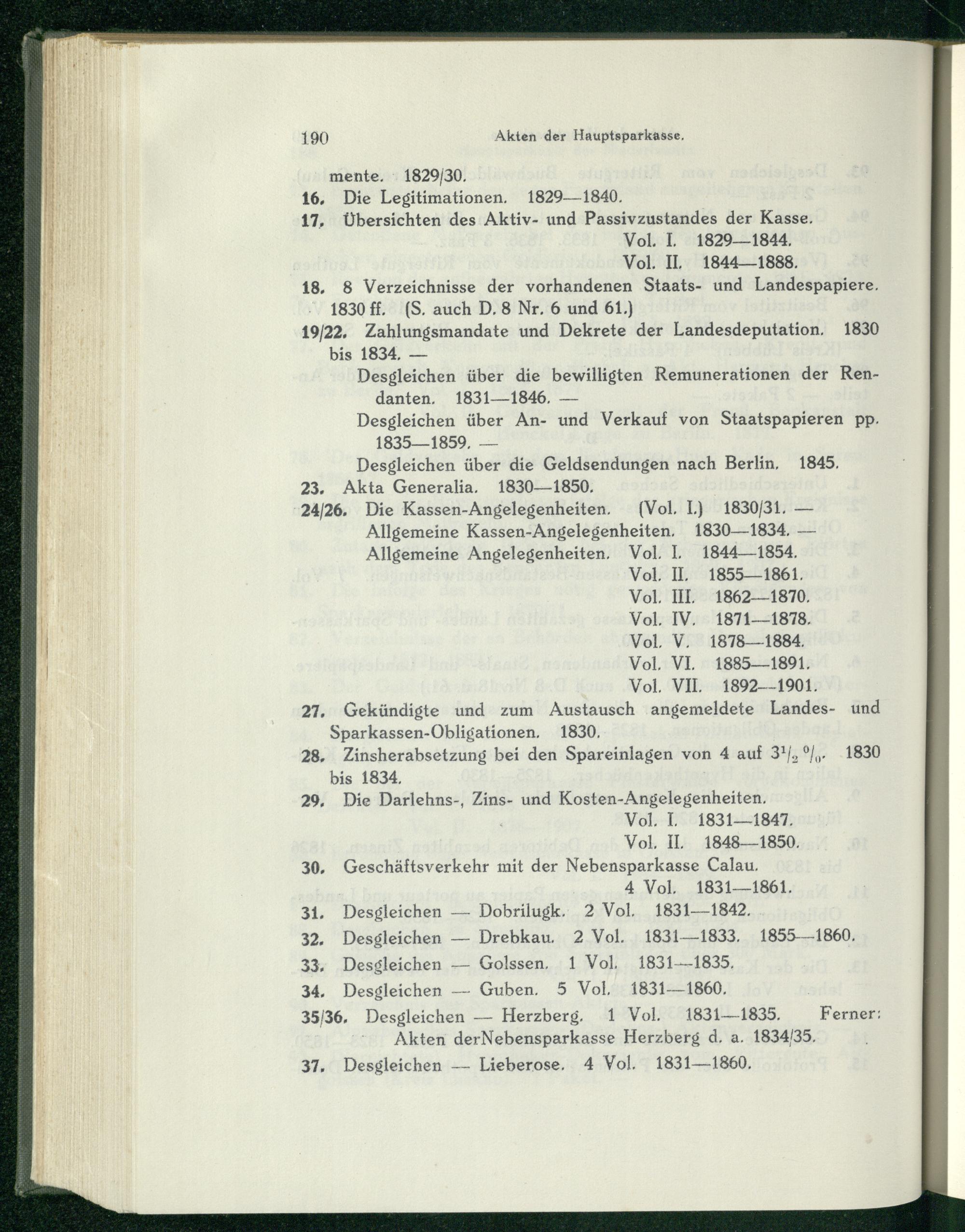 mente. 1829/30, 16. Die Legitimationen, 1829—1840, 17, Übersichten des Aktiv- und Passivzustandes der Kasse, Vol. I, 1829—1844, Vol. IL 1844—1888, 18, 8 Verzeichnisse der vorhandenen Staats- und Landespapiere, 1830 ff.(S. auch D. 8 Nr. 6 und 61.) 19/22. Zahlungsmandate und Dekrete der Landesdeputation, 1830 bis 1834,— Desgleichen über die bewilligten Remunerationen der Rendanten. 1831—1846,— Desgleichen über An- und Verkauf von Staatspapieren pp. 1835— 1859,— Desgleichen über die Geldsendungen nach Berlin , 1845,