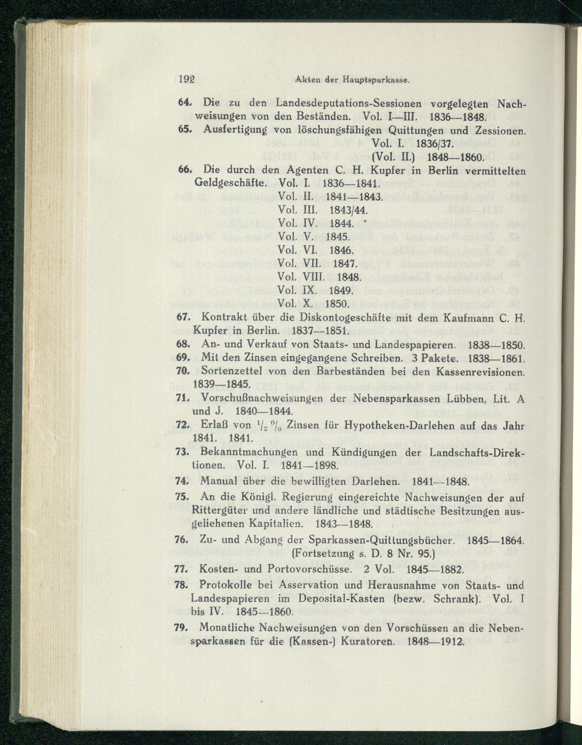 64. Die zu den Landesdeputations-Sessionen vorgelegten Nachweisungen von den Beständen. Vol. I—III, 1836-—1848, 65, Ausfertigung von löschungsfähigen Quittungen und Zessionen, Vol. I. 1836/37. (Vol. IL) 1848—1860. 66. Die durch den Agenten C. H. Kupfer in Berlin vermittelten Geldgeschäfte, Vol, I, 1836—1841, Vol, IL. 1841—1843. Vol, IL 1843/44. Vol. IV. 1844,* Vol: V.: 1845. Vol. VI. 1846, Vol, VIL 1847, Vol. VIIL 1848. Vol, IX. 1849. Vol. X. 1850; 67, Kontrakt über die Diskontogeschäfte mit dem Kaufmann C. H. Kupfer in Berlin , 1837—1851, 68, An- und Verkauf von Staats- und Landespapieren. 1838—1850. 69. Mit den Zinsen eingegangene Schreiben, 3 Pakete. 1838—1861. 70. Sortenzettel von den Barbeständen bei den Kassenrevisionen. 1839-—1845, 71. Vorschußnachweisungen der Nebensparkassen Lübben , Lit. A und J, 1840—1844, 72, Erlaß von'/,°/, Zinsen für Hypotheken-Darlehen auf das Jahr 1841, 1841, 73, Bekanntmachungen und Kündigungen der Landschafts-Direktionen, Vol, I, 1841—1898,