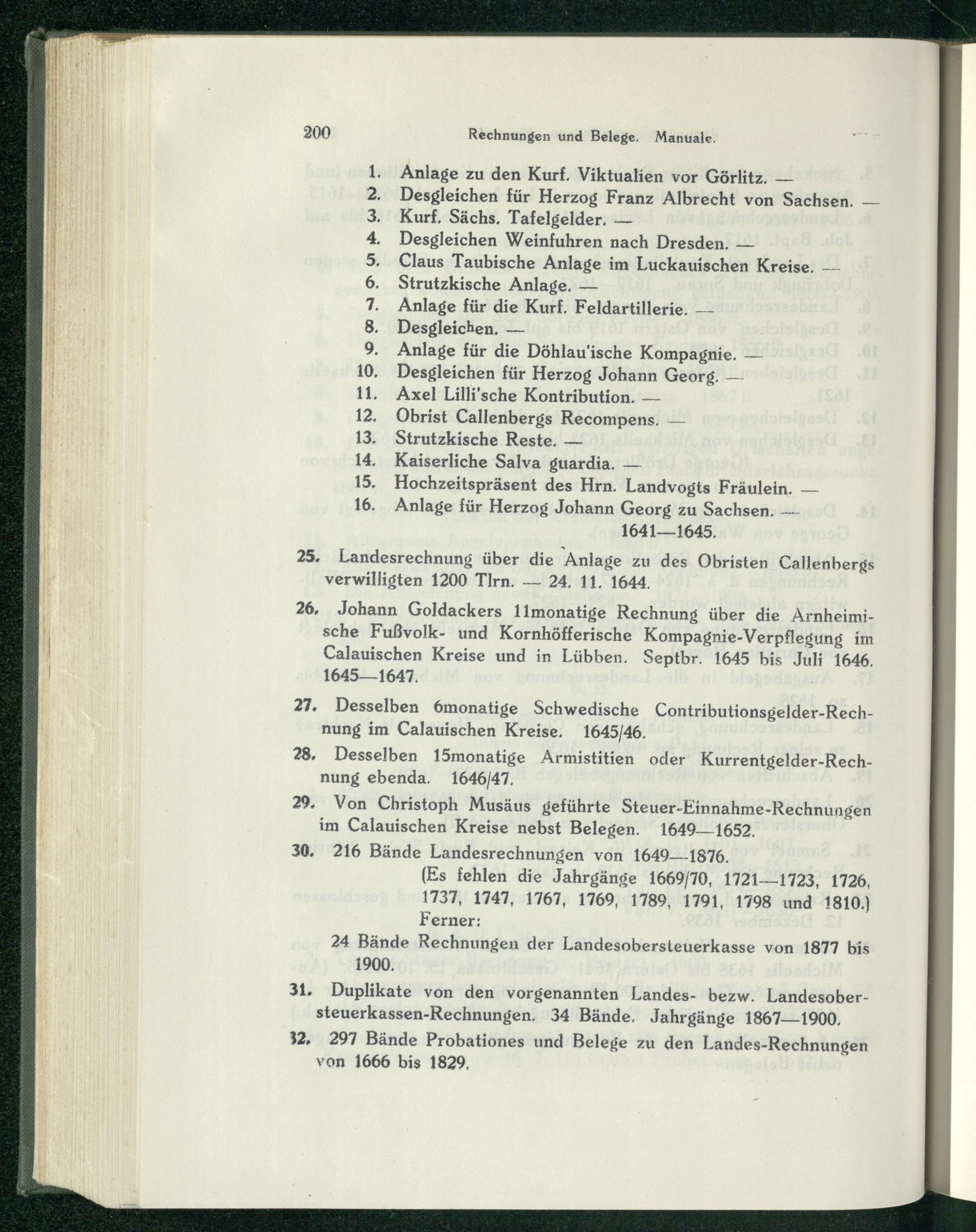 27. Desselben 6monatige Schwedische Contributionsgelder-Rechnung im Calauischen Kreise. 1645/46. 28, Desselben 15monatige Armistitien oder Kurrentgelder-Rechnung ebenda. 1646/47. 29, Von Christoph Musäus geführte Steuer-Einnahme-Rechnungen im Calauischen Kreise nebst Belegen. 1649-—1652. 30. 216 Bände Landesrechnungen von 1649-—1876. (Es fehlen die Jahrgänge 1669/70, 1721-—1723, 1726, 1737, 1747, 1767, 1769, 1789, 1791, 1798 und 1810.) Ferner: 24 Bände Rechnungen der Landesobersteuerkasse von 1877 bis 1900.
