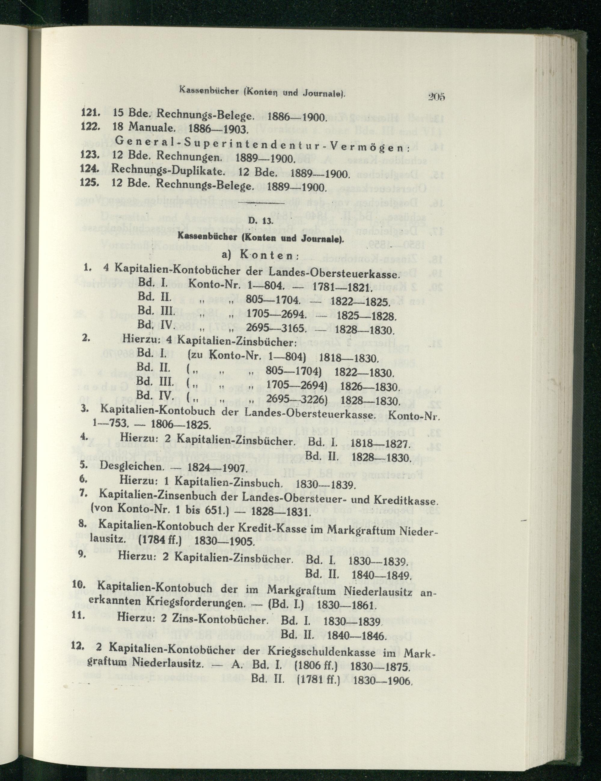 a) Konten: 1, 4 Kapitalien-Kontobücher der Landes-Obersteuerkasse. Bd. IL. Konto-Nr. 1-—804.... 1781—1821. Bd. IL x„ 805—1704.— 1822-1825. Bd. IL. u 1705-—2694,-——— 1825—1828. Bd. IV."„ 2695—3165,— 1828—1830. Hierzu: 4 Kapitalien-Zinsbücher: Bd. I.(zu Konto-Nr. 1—804) 1818-1830, Bd: IL(, 7 ‚„ 805—1704) 1822-—1830. Ba. 1,£.,; M ‚;, 1705-—2694) 1826—1830. Bd. IV,(ps 1m... n.] 26953226)... 1828-—— 1830. 3, Kapitalien-Kontobuch der Landes-Obersteuerkasse. Konto-Nr. 1-—753,— 1806-—1825. 4. Hierzu: 2 Kapitalien-Zinsbücher. Bd. I. 1818—1827. Bd. IL. 1828-1830. 5, Desgleichen.-— 1824-—1907. 6, Hierzu: 1 Kapitalien-Zinsbuch, 1830-—1839. 7, Kapitalien-Zinsenbuch der Landes-Obersteuer- und Kreditkasse. {von Konto-Nr. 1 bis 651.)— 1828—1831.| 8. Kapitalien-Kontobuch der Kredit-Kasse im Markgraftum Nieder lausitz. (1784 ff.) 1830—1905. 9, Hierzu: 2 Kapitalien-Zinsbücher. Bd. I. 1830-1839, Bd. Il, 1840—1849, 16, Kapitalien-Kontobuch der im Markgraftum Niederlausitz anerkannten Kriegsforderungen,—(Bd. I.) 1830-1861. 11. Hierzu: 2 Zins-Kontobücher. Bd. I. 1830—1839 Bd. IL. 1840-—1846. 12, 2 Kapitalien-Kontobücher der Kriegsschuldenkasse im Markgraftum Niederlausitz.— A, Bd. I.(1806 ff.) 1830-—1875. Bd. IL.(1781 ff) 1830—1906,
