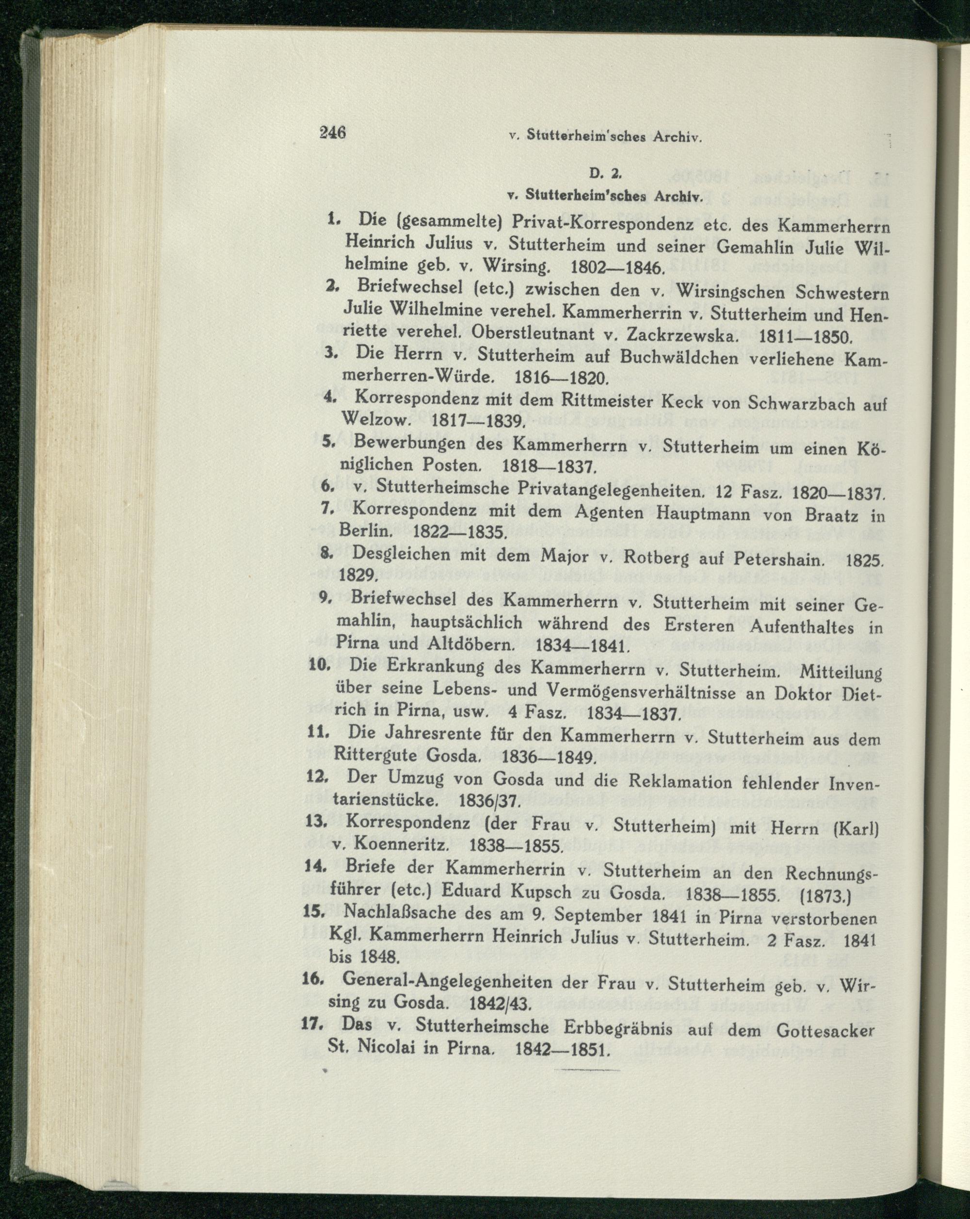 14. Briefe der Kammerherrin v. Stutterheim an den Rechnungsführer(etc.) Eduard Kupsch zu Gosda. 1838-—1855.(1873.) 15, Nachlaßsache des am 9, September 1841 in Pirna verstorbenen Kgl, Kammerherrn Heinrich Julius v. Stutterheim. 2 Fasz. 1841