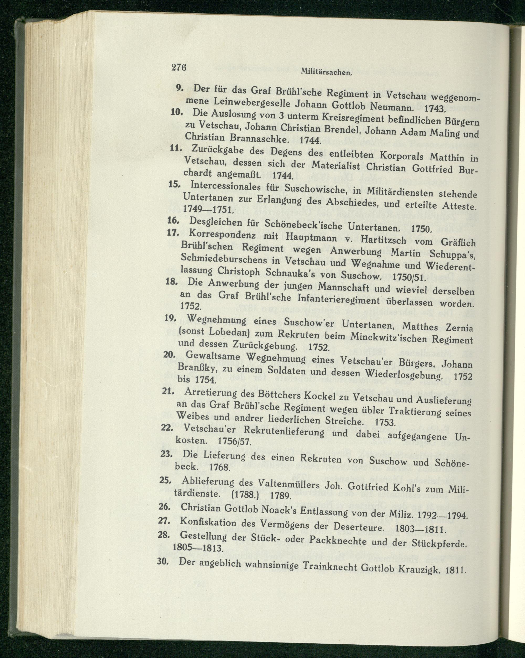 9, Der für das Graf Brühl'sche Regiment in Vetschau weggenommene Leinwebergeselle Johann Gottlob Neumann. 1743.