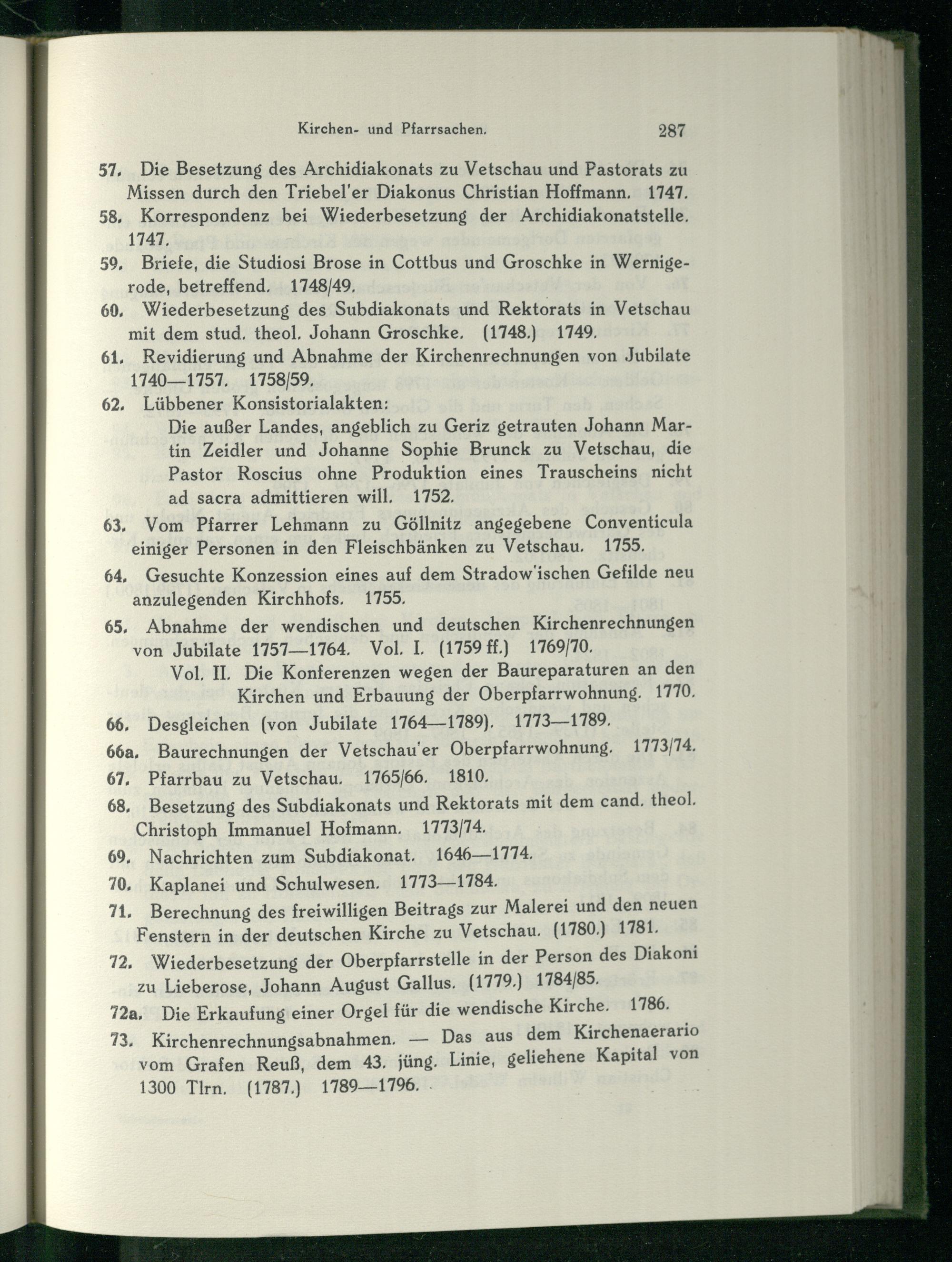 57, Die Besetzung des Archidiakonats zu Vetschau und Pastorats zu Missen durch den Triebel’er Diakonus Christian Hoffmann. 1747. 58, Korrespondenz bei Wiederbesetzung der Archidiakonatstelle, 1747, 59, Briefe, die Studiosi Brose in Cottbus und Groschke in Wernige rode , betreffend, 1748/49, 60, Wiederbesetzung des Subdiakonats und Rektorats in Vetschau mit dem stud, theol, Johann Groschke,(1748.) 1749, 61, Revidierung und Abnahme der Kirchenrechnungen von Jubilate 1740—1757, 1758/59, 62. Lübbener Konsistorialakten: Die außer Landes, angeblich zu Geriz getrauten Johann Martin Zeidler und Johanne Sophie Brunck zu Vetschau , die Pastor Roscius ohne Produktion eines Trauscheins nicht ad sacra admittieren will, 1752, 63, Vom Pfarrer Lehmann zu Göllnitz angegebene Conventicula einiger Personen in den Fleischbänken zu Vetschau . 1755, 64, Gesuchte Konzession eines auf dem Stradow'ischen Gefilde neu anzulegenden Kirchhofs, 1755, 65, Abnahme der wendischen und deutschen Kirchenrechnungen von Jubilate 1757—1764, Vol. I,(1759 ff.) 1769/70, Vol. IL Die Konferenzen wegen der Baureparaturen an den Kirchen und Erbauung der Oberpfarrwohnung. 1770, 66, Desgleichen(von Jubilate 1764—1789). 1773—1789, 66a, Baurechnungen der Vetschau ’er Oberpfarrwohnung, 1773/74. 67, Pfarrbau zu Vetschau , 1765/66. 1810, 68, Besetzung des Subdiakonats und Rektorats mit dem cand, theol, Christoph Immanuel Hofmann, 1773/74. 69, Nachrichten zum Subdiakonat. 1646—1774, 70, Kaplanei und Schulwesen, 1773—1784. 71, Berechnung des freiwilligen Beitrags zur Malerei und den neuen Fenstern in der deutschen Kirche zu Vetschau. (1780.) 1781. 72. Wiederbesetzung der Oberpfarrstelle in der Person des Diakoni zu Lieberose , Johann August Gallus.(1779) 1784/85, 72a, Die Erkaufung einer Orgel für die wendische Kirche. 1786. 73, Kirchenrechnungsabnahmen.— Das aus dem Kirchenaerario vom Grafen Reuß, dem 43. jüng. Linie, geliehene Kapital von 1300 Tirn.(1787.) 1789—1796.