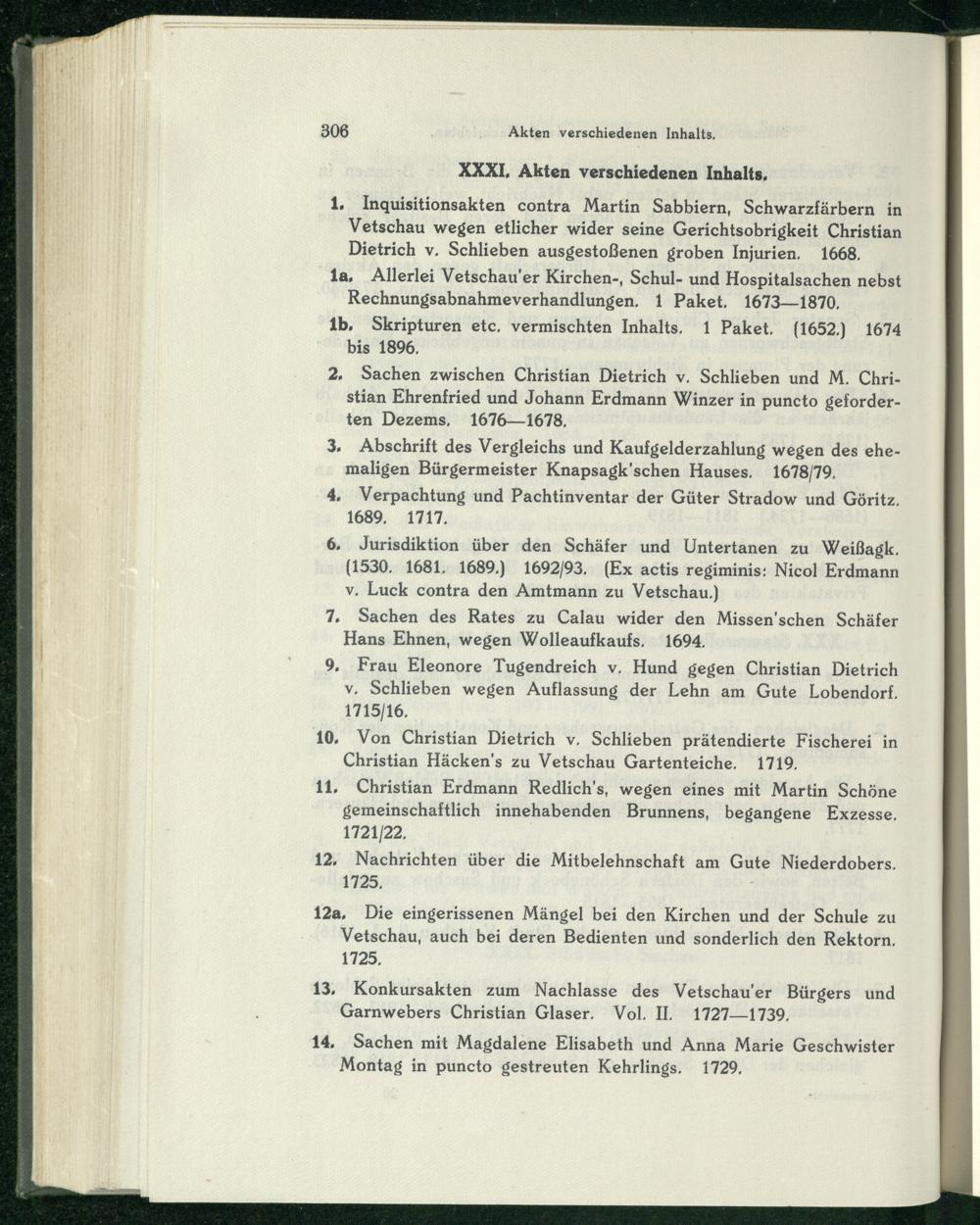 1. Inquisitionsakten contra Martin Sabbiern, Schwarzfärbern in Vetschau wegen etlicher wider seine Gerichtsobrigkeit Christian Dietrich v. Schlieben ausgestoßenen groben Injurien. 1668,