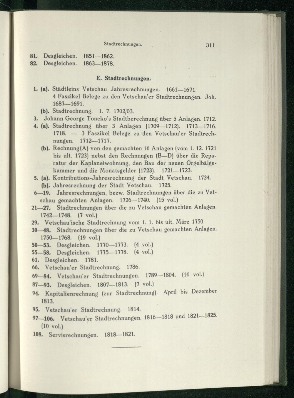 6—19, Jahresrechnungen, bezw. Stadtrechnungen über die zu Vet schau gemachten Anlagen. 1726—1740.(15 vol.) 21—27, Stadtrechnungen über die zu Vetschau gemachten Anlagen,