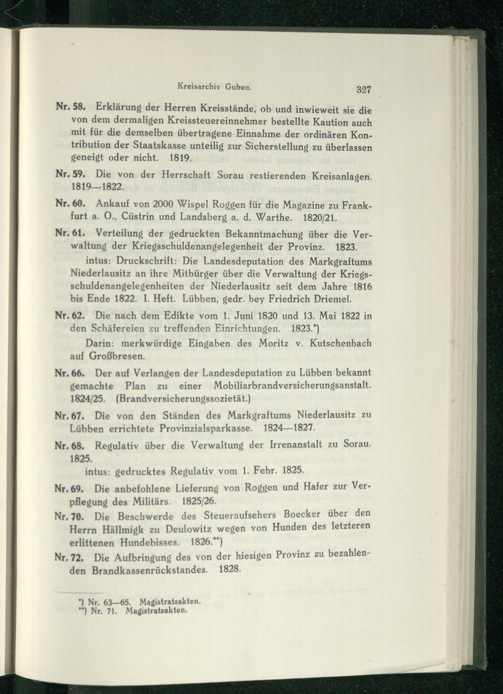 Nr,67. Die von den Ständen des Markgraftums Niederlausitz zu Lübben errichtete Provinzialsparkasse. 1824—1827.
