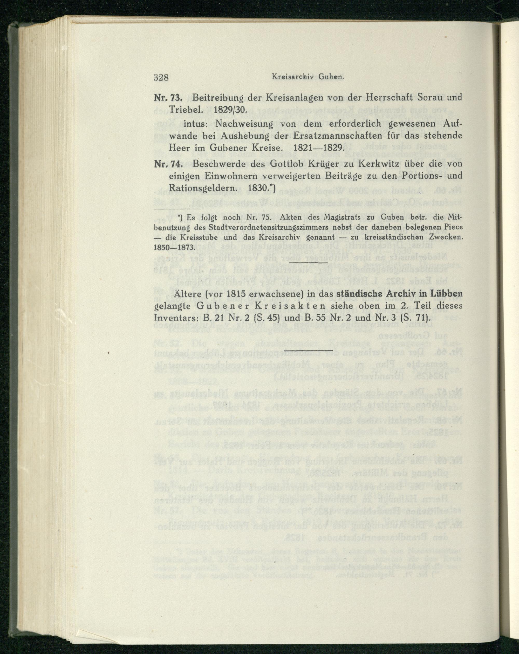 *) Es folgt noch Nr, 75, Akten des Magistrats zu Guben betr. die Mitbenutzung des Stadtverordnetensitzungszimmers nebst der daneben belegenen Piece — die Kreisstube und das Kreisarchiv genannt— zu kreisständischen Zwecken, 1850—1873,