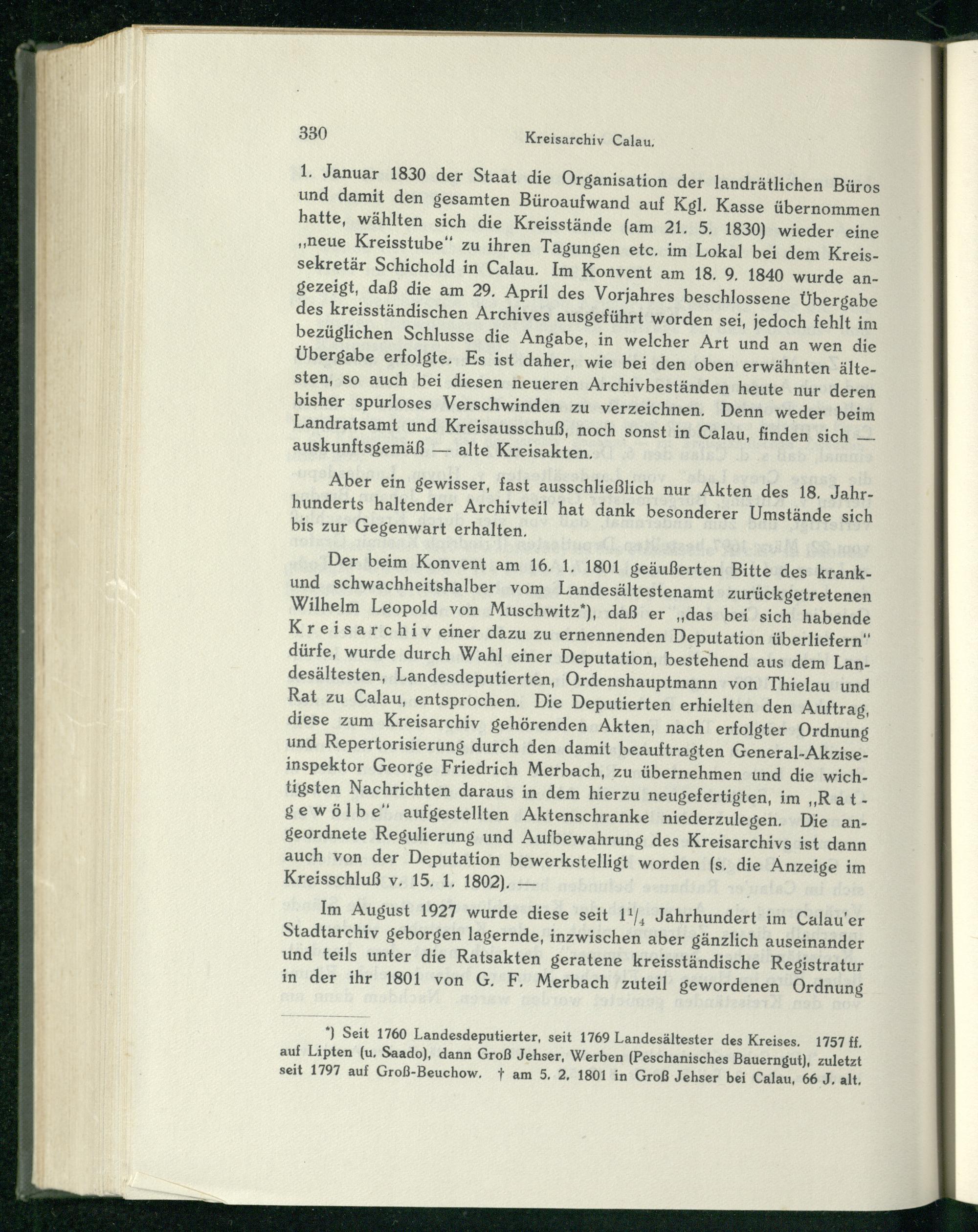 Der beim Konvent am 16. 1, 1801 geäußerten Bitte des krankund schwachheitshalber vom Landesältestenamt zurückgetretenen Wilhelm Leopold von Muschwitz”), daß er„das bei sich habende Kreisarchiv einer dazu zu ernennenden Deputation überliefern“ dürfe, wurde durch Wahl einer Deputation, bestehend aus dem Landesältesten, Landesdeputierten, Ordenshauptmann von Thielau und Rat zu Calau , entsprochen. Die Deputierten erhielten den Auftrag, diese zum Kreisarchiv gehörenden Akten, nach erfolgter Ordnung und Repertorisierung durch den damit beauftragten General-Akziseinspektor George Friedrich Merbach, zu übernehmen und die wichtigsten Nachrichten daraus in dem hierzu neugefertigten, im„Ratgewölbe‘ aufgestellten Aktenschranke niederzulegen. Die angeordnete Regulierung und Aufbewahrung des Kreisarchivs ist dann auch von der Deputation bewerkstelligt worden(s. die Anzeige im Kreisschluß v, 15, 1, 1802).—