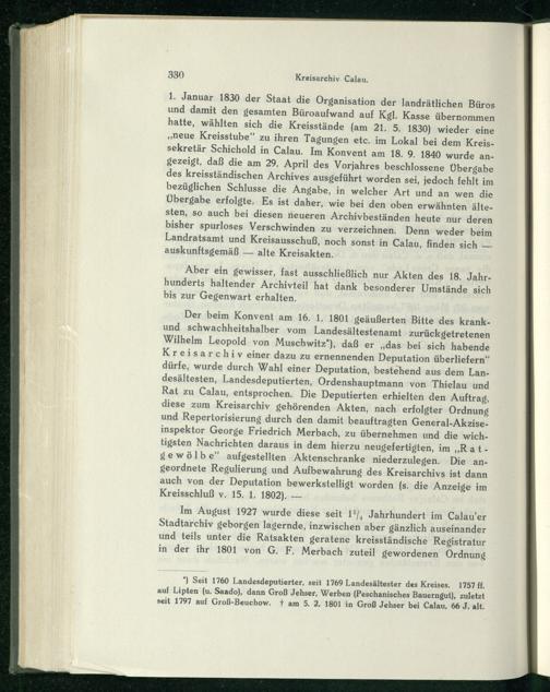 1. Januar 1830 der Staat die Organisation der landrätlichen Büros und damit den gesamten Büroaufwand auf Kgl. Kasse übernommen hatte, wählten sich die Kreisstände(am 21. 5. 1830) wieder eine „neue Kreisstube‘“ zu ihren Tagungen etc, im Lokal bei dem Kreissekretär Schichold in Calau . Im Konvent am 18. 9. 1840 wurde angezeigt, daß die am 29, April des Vorjahres beschlossene Übergabe des kreisständischen Archives ausgeführt worden sei, jedoch fehlt im bezüglichen Schlusse die Angabe, in welcher Art und an wen die Übergabe erfolgte. Es ist daher, wie bei den oben erwähnten ältesten, so auch bei diesen neueren Archivbeständen heute nur deren bisher spurloses Verschwinden zu verzeichnen. Denn weder beim Landratsamt und Kreisausschuß, noch sonst in Calau , finden sich— auskunftsgemäß—. alte Kreisakten.