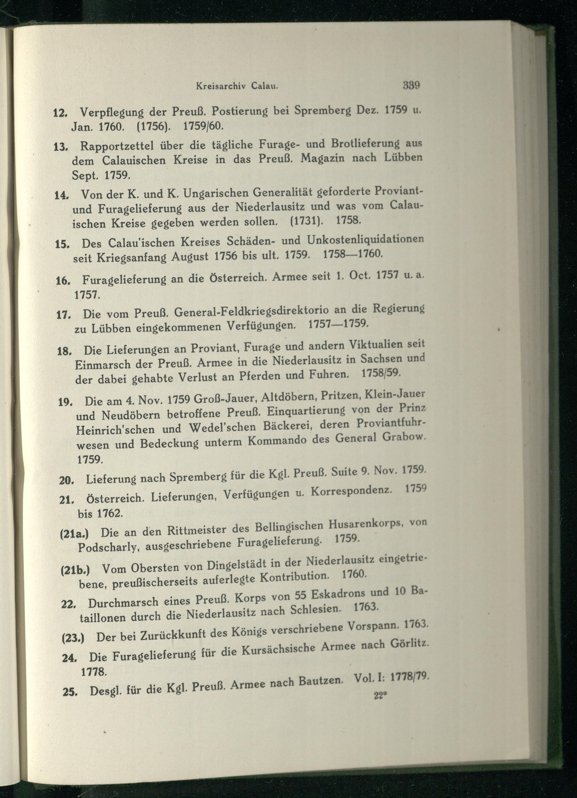 19, Die am 4. Nov. 1759 Groß-Jauer, Altdöbern , Pritzen , Klein-Jauer und Neudöbern betroffene Preuß. Einquartierung von der Prinz Heinrich'schen und Wedel 'schen Bäckerei, deren Proviantfuhrwesen und Bedeckung unterm Kommando des General Grabow.