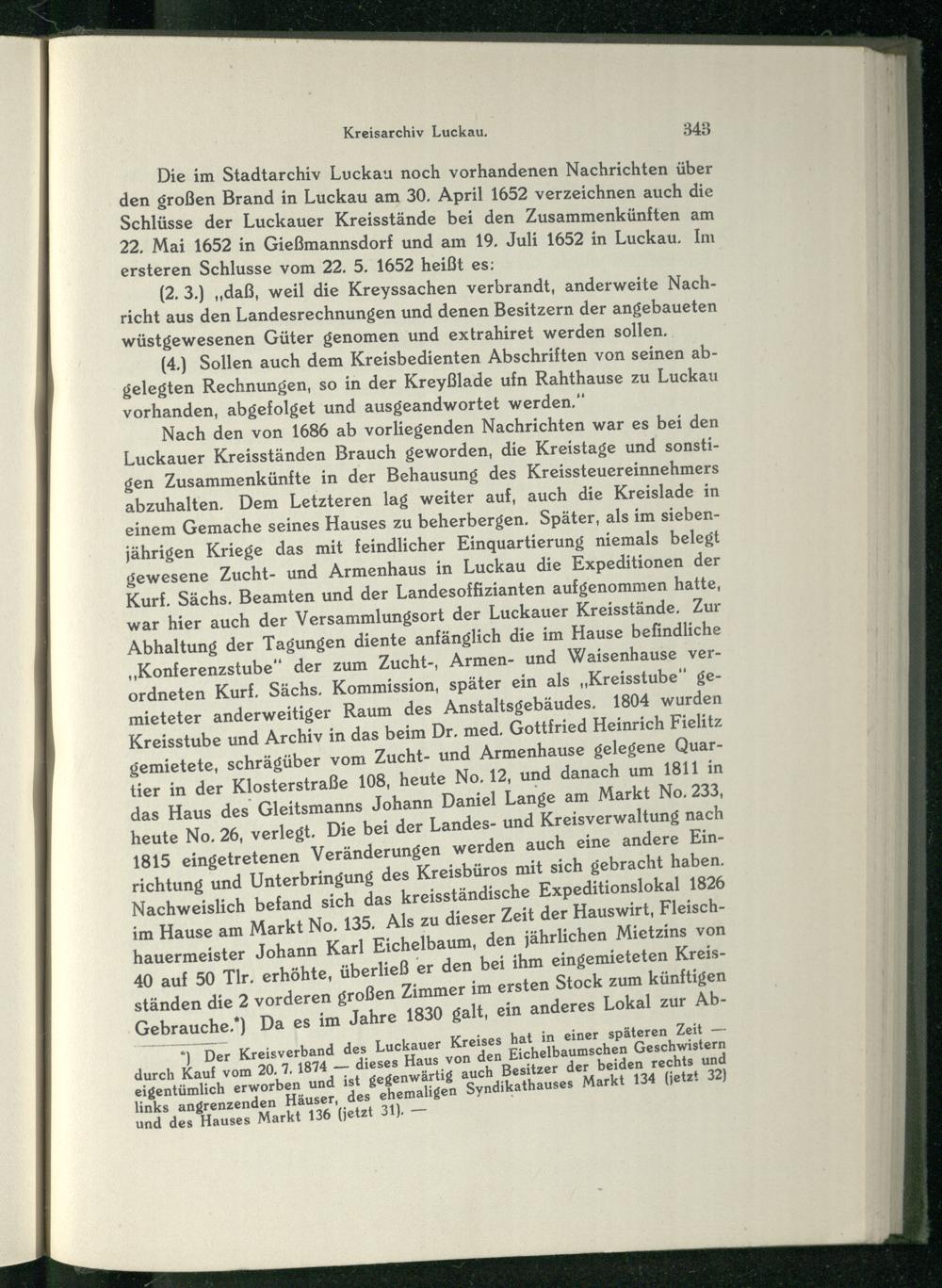 Nach den von 1686 ab vorliegenden Nachrichten war es bei den Luckauer Kreisständen Brauch geworden, die Kreistage und sonstigen Zusammenkünfte in der Behausung des Kreissteuereinnehmers abzuhalten. Dem Letzteren lag weiter auf, auch die Kreislade in einem Gemache seines Hauses zu beherbergen. Später, als im siebenjährigen Kriege das mit feindlicher Einquartierung niemals belegt gewesene Zucht- und Armenhaus in Luckau die Expeditionen der Kurf. Sächs. Beamten und der Landesoffizianten aufgenommen hatte, war hier auch der Versammlungsort der Luckauer Kreisstände. Zur Abhaltung der Tagungen diente anfänglich die im Hause befindliche „Konferenzstube” der zum Zucht-, Armen- und Waisenhause verordneten Kurf, Sächs, Kommission, später ein als„Kreisstube” gemieteter anderweitiger Raum des Anstaltsgebäudes, 1804 wurden Kreisstube und Archiv in das beim Dr. med. Gottfried Heinrich Fielitz gemietete, schrägüber vom Zucht- und Armenhause gelegene Quartier in der Klosterstraße 108, heute No. 12, und danach um 1811 in das Haus des Gleitsmanns Johann Daniel Lange am Markt No. 233, heute No. 26, verlegt. Die bei der Landes- und Kreisverwaltung nach 1815 eingetretenen Veränderungen werden auch eine andere Einrichtung und Unterbringung des Kreisbüros mit sich gebracht haben. Nachweislich befand sich das kreisständische Expeditionslokal 1826 im Hause am Markt No. 135, Als zu dieser Zeit der Hauswirt, Fleischhauermeister Johann Karl Eichelbaum, den jährlichen Mietzins von 40 auf 50 Tir. erhöhte, überließ er den bei ihm eingemieteten Kreisständen die 2 vorderen großen Zimmer im ersten Stock zum künftigen Gebrauche.‘) Da es im Jahre 1830 galt, ein anderes Lokal zur Ab