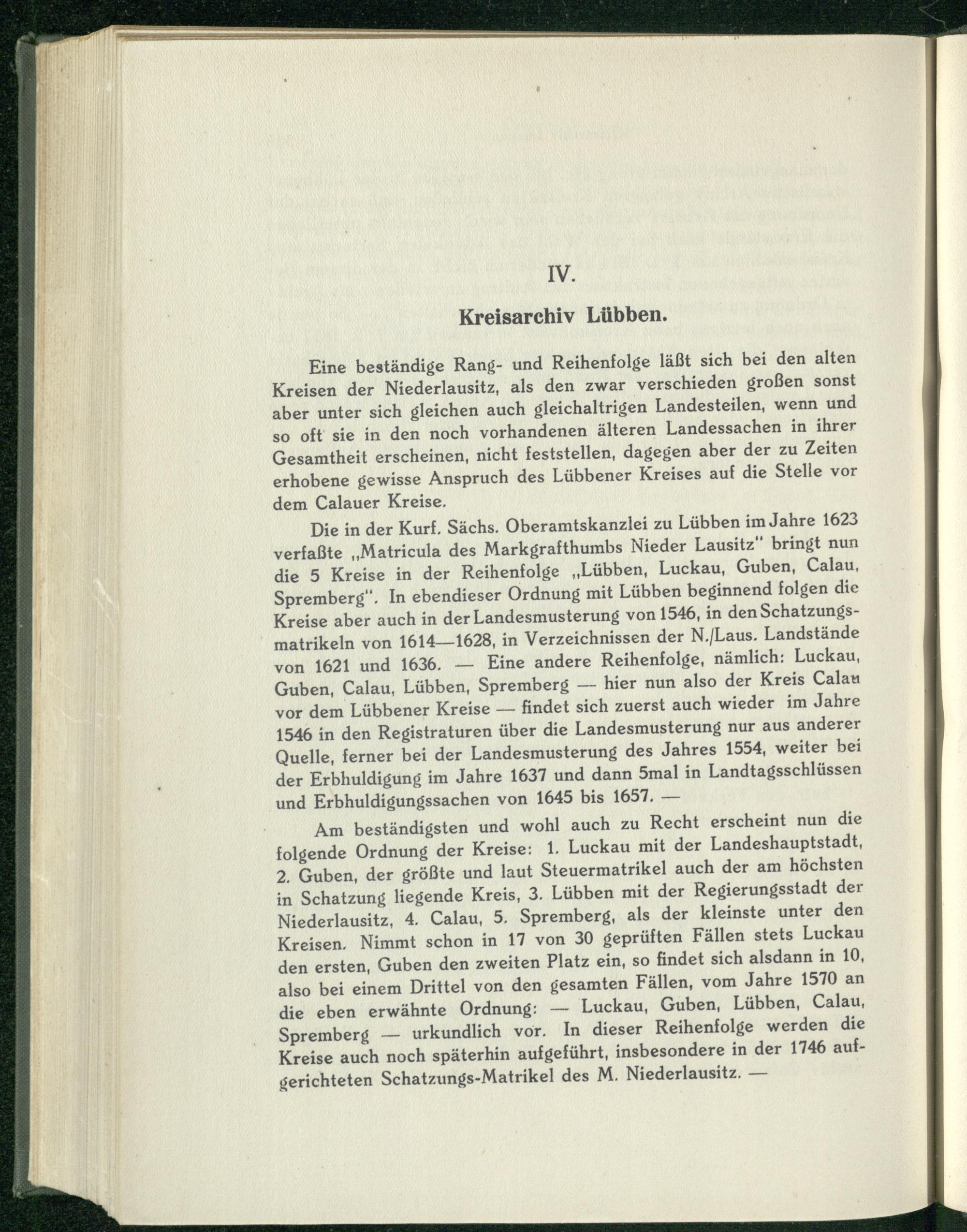 Die in der Kurf. Sächs. Oberamtskanzlei zu Lübben im Jahre 1623 verfaßte ‚„‚Matricula des Markgrafthumbs Nieder Lausitz‘ bringt nun die 5 Kreise in der Reihenfolge„Lübben , Luckau , Guben , Calau , Spremberg ‘. In ebendieser Ordnung mit Lübben beginnend folgen die Kreise aber auch in der Landesmusterung von 1546, in den Schatzungsmatrikeln von 1614-—1628, in Verzeichnissen der N./Laus. Landstände von 1621 und 1636.— Eine andere Reihenfolge, nämlich: Luckau , Guben , Calau , Lübben , Spremberg —- hier nun also der Kreis Calau vor dem Lübbener Kreise— findet sich zuerst auch wieder im Jahre 1546 in den Registraturen über die Landesmusterung nur aus anderer Quelle, ferner bei der Landesmusterung des Jahres 1554, weiter bei der Erbhuldigung im Jahre 1637 und dann 5mal in Landtagsschlüssen und Erbhuldigungssachen von 1645 bis 1657,—