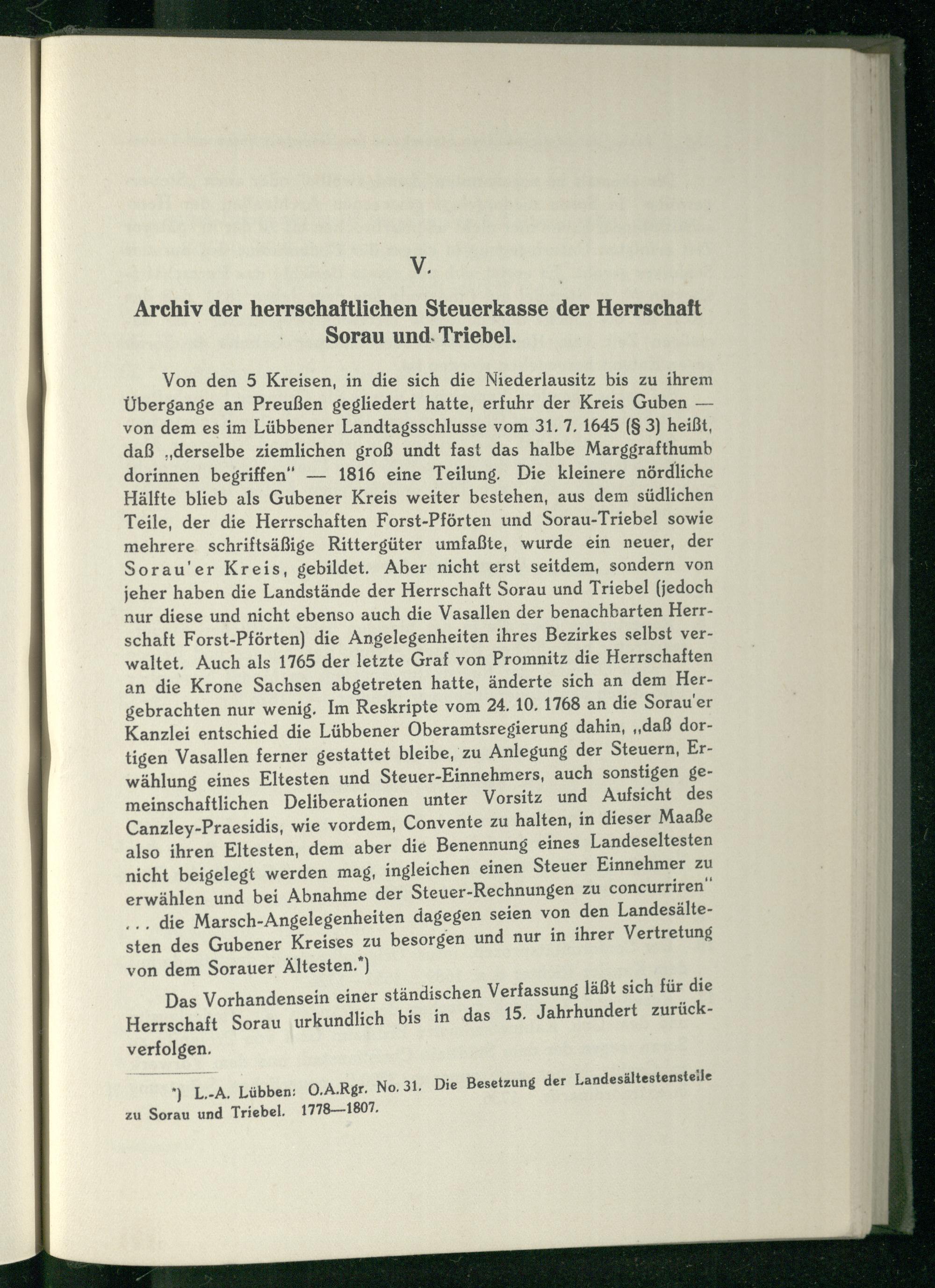 Von den 5 Kreisen, in die sich die Niederlausitz bis zu ihrem Übergange an Preußen gegliedert hatte, erfuhr der Kreis Guben — von dem es im Lübbener Landtagsschlusse vom 31. 7, 1645(8 3) heißt, daß„derselbe ziemlichen groß undt fast das halbe Marggrafthumb dorinnen begriffen“— 1816 eine Teilung. Die kleinere nördliche Hälfte blieb als Gubener Kreis weiter bestehen, aus dem südlichen Teile, der die Herrschaften Forst-Pförten und Sorau -Triebel sowie mehrere. schriftsäßige Rittergüter umfaßte, wurde ein neuer, der Sorau ’er Kreis, gebildet. Aber nicht erst seitdem, sondern von jeher haben die Landstände der Herrschaft Sorau und Triebel(jedoch nur diese und nicht ebenso auch die Vasallen der benachbarten Herrschaft Forst-Pförten) die Angelegenheiten ihres Bezirkes selbst verwaltet. Auch als 1765 der letzte Graf von Promnitz die Herrschaften an die Krone Sachsen abgetreten hatte, änderte sich an dem Hergebrachten nur wenig. Im Reskripte vom 24. 10. 1768 an die Sorau 'er Kanzlei entschied die Lübbener Oberamtsregierung dahin,„daß dortigen Vasallen ferner gestattet bleibe, zu Anlegung der Steuern, Erwählung eines Eltesten und Steuer-EFinnehmers, auch sonstigen gemeinschaftlichen Deliberationen unter Vorsitz und Aufsicht des Canzley-Praesidis, wie vordem, Convente zu halten, in dieser Maaße also ihren Eltesten, dem aber die Benennung eines Landeseltesten nicht beigelegt werden mag, ingleichen einen Steuer Einnehmer zu erwählen und bei Abnahme der Steuer-Rechnungen zu concurriren” „.. die Marsch-Angelegenheiten dagegen seien von den Landesältesten des Gubener Kreises zu besorgen und nur in ihrer Vertretung von dem Sorauer Ältesten.”)