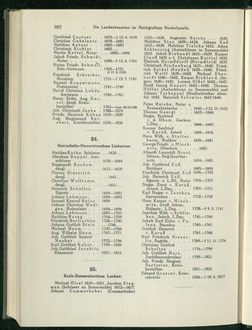1620—1624, Augustus Reiche... 1630. Melchior Stoy 1629—1634, Johann Exß 1633—1638, Melchior Tielcke 1633. Adam Schleusing(Amtschösser in Sonnewalde ) 1633, Jakob Brabandt 1635—1639. Kaspar Clauß 1635 u.f, Christianus Knittel 1635. Dietrich Heimßdorff(Heimßfeld) 1637. Christoph Hindenburg 1637—1642, Friedrich Seidel(Seydel) 1638—1640, Friedrich Wolff 1639—1642, Michael Eberhardt 1640—1642, Kaspar Richter d. Jüngere 1640—1641, Lorenz Ölßel 1642—1647. Hanß Georg Knautt 1642—1645; Thomas Höffer(Amtschösser zu Sonnewalde ) und Johann Tscheppel(Stadtschreiber ebenda) 1642. Heinrich Schimler 1643/1644.