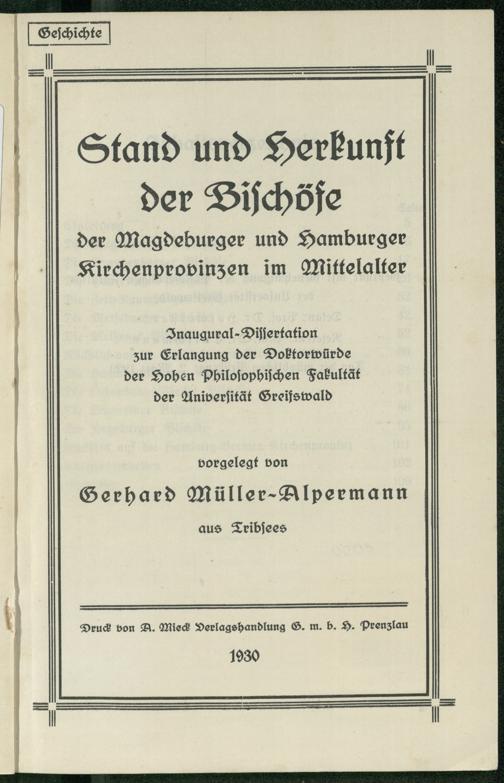 er. Stand und Herkunft der Giſchöfe der Magdeburger und Hamburger Kirchenprovinzen im Mittelalter Inaugural · Diſſertation zur Erlangung der Dobtorwürde der Hohen Philoſophiſchen Fakultät der Aniverſitãt Greijswald vorgelegt von Gerhard Müller-Alpermann aus Tribſees Druck von A. Mieck Derlagshandlung S. m. b. H. Prenzlau 1930