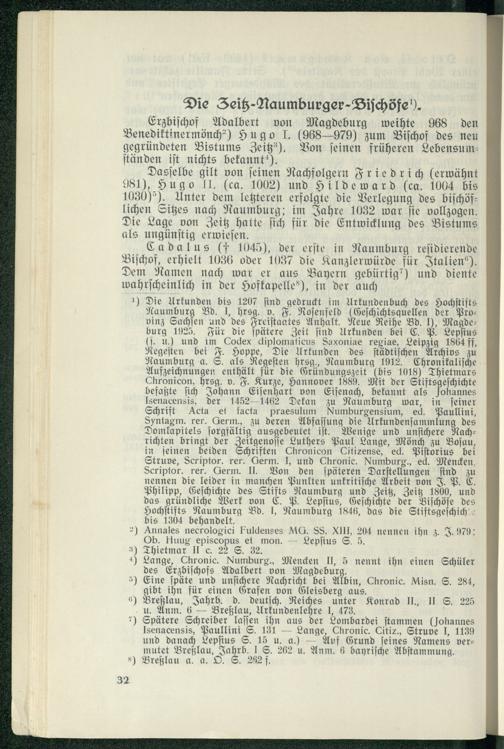 Erzbiſchof Adalbert von Magdeburg weihte 968 den Benediktinermönch?) Hugo I. (9668= 979) zum Biſchof des neu gegründeten Bistums Zeitz '). Von feinen früheren Lebensum— ſtänden iſt nichts bekannt“).