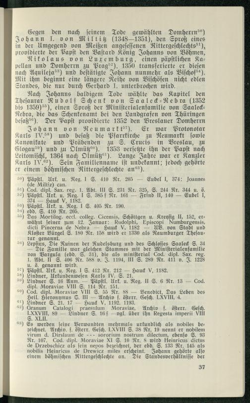 Johann von Neumarktet). Er war Protonotar Karls IV. ss) und beſaß die Pfarrkirche zu Neumarkt ſowie Kanonikate und Präbenden zu S. Crucis in Breslau , zu Glogause) und zu Olmütz ). 1353 verſetzte ihn der Papſt nach Leitomiſchl , 1364 nach Olmützé i). Lange Jahre war er Kanzler Karls IV. 52). Sein Familienname iſt unbekannt; jedoch gehörte er einem böhmiſchen Rittergeſchlechte anss). zo) Päpſtl. Urk. u. Reg. 1 S. 410 Nr. 205— Eubel 1, 374: Joannes