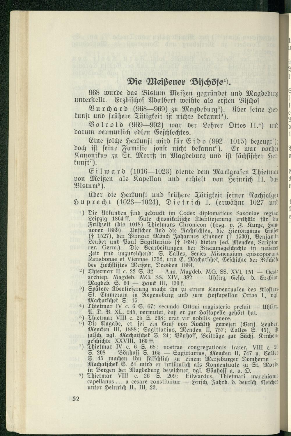 1) Die Urkunden ſind gedruckt im Codex diplomaticus Saxoniae regiae, Leipzig 1864 ff. Gute chronikaliſche Überlieferung enthält für die Frühzeit(bis 1018) Thietmars Chronicon(hrsg. v. F. Kurze, Han nover 1889). AUnſicher ſind die Nachrichten, die Hieronymus Emſer (+ 1527), der Pirnger Mönch Johannes Lindner(F 15305, Benjamin Leuber und Paul Sagittarius(f 1694) bieten(ed. Mencken , Scriptor. rer. Germ.). Die Bearbeitungen der Bistumsgeſchichte in neuerer Zeit ſind unzureichend: S. Calles, Series Misnensium episcoporum, RKatisbonae et Viennae 1752, und E. Machatſchek, Geſchichte der Biſchöfe des Hochſtiftes Meißen, Dresden 1884. Thietmar II c. 22 S. 32— Ann. Magdeb. MG. SS. XVI, 151— Gesta archiep. Magdeb. MG. SS. XIV, 382— AUhlirz, Geſch. d. Erzbist. Magdeb. S. 60— Hauck Ill, 130. Spätere Überlieferung macht ihn zu einem Konventualen des Kloſters St. Emmeram in Regensburg und zum Hofkapellan Ottos J, vgl. Machatſchek S. 15. Thietmar IV c. 6 S. 67: secundo Ottoni magisterio prefuit— Uhlirz, A. D. B. XL, 245, vermutet, daß er zur Hofkapelle gehört hat. Thietmar VIII c. 25 S. 208: erat vir nobilis genere. Die Angabe, er[ei ein Graf von Rochlitz geweſen(Benj. Leuber, Menden Il, 1888; Sagittarius, Menden Il, 757; Ealles S. 45), it falſch, vgl. Machatſchek S. 24; Bönhoff, Beiträge zur Sächſ. Kirchen— geſchichte XXVlIII, 160 ff. Thietmar IV c. 6 S. 68: nostrae congregationis frater, VIII c. 25 S. 208— Bönhoff S. 165— Sagittarkus, Menden II, 747 u. Calles S. 45 machen ihn fälſchlich zu einem Merſeburger Domherrn. Machatſchek S. 24 wird er irrtümlich als Konventuale zu St. Moritz in Bergen bei Magdeburg bezeichnet, vgl. Bönhoff a. a. O.. 8) Thietmar VIII c. 26 S. 209: Eilwardus, Thietmari marchionis capellanus... a cesare constituitur— Hirſch, Jahrb. d. deutſch. Reiches unter Heinrich II , IM, 23.