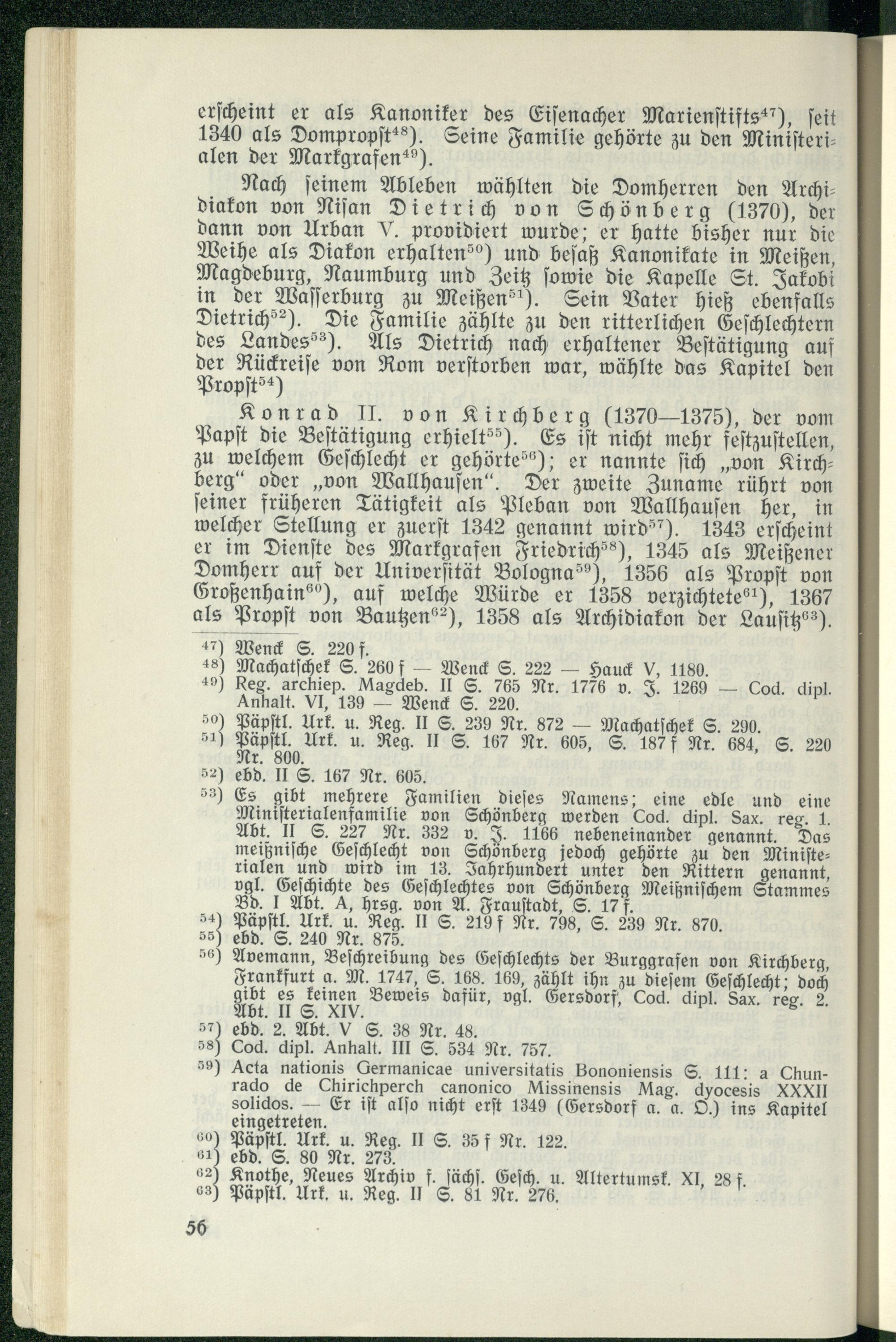 Nach ſeinem Ableben wählten die Domherren den Archidiakon von Niſan Dietrich von Schönberg(1370), der dann von Urban V. providiert wurde; er hatte bisher nur die Weihe als Diakon erhaltenso) und beſaß Kanonikate in Meißen , Magdeburg , Naumburg und Zeitz ſowie die Kapelle St. Jakobi in der Waſſerburg zu Meißensih. Sein Vater hieß ebenfalls Dietrich‘). Die Familie zählte zu den ritterlichen Geſchlechtern des Landes“): Als Dietrich nach erhaltener Beſtätigung auf der Rückreiſe von Rom verſtorben war, wählte das Kapitel den Propſt?*)