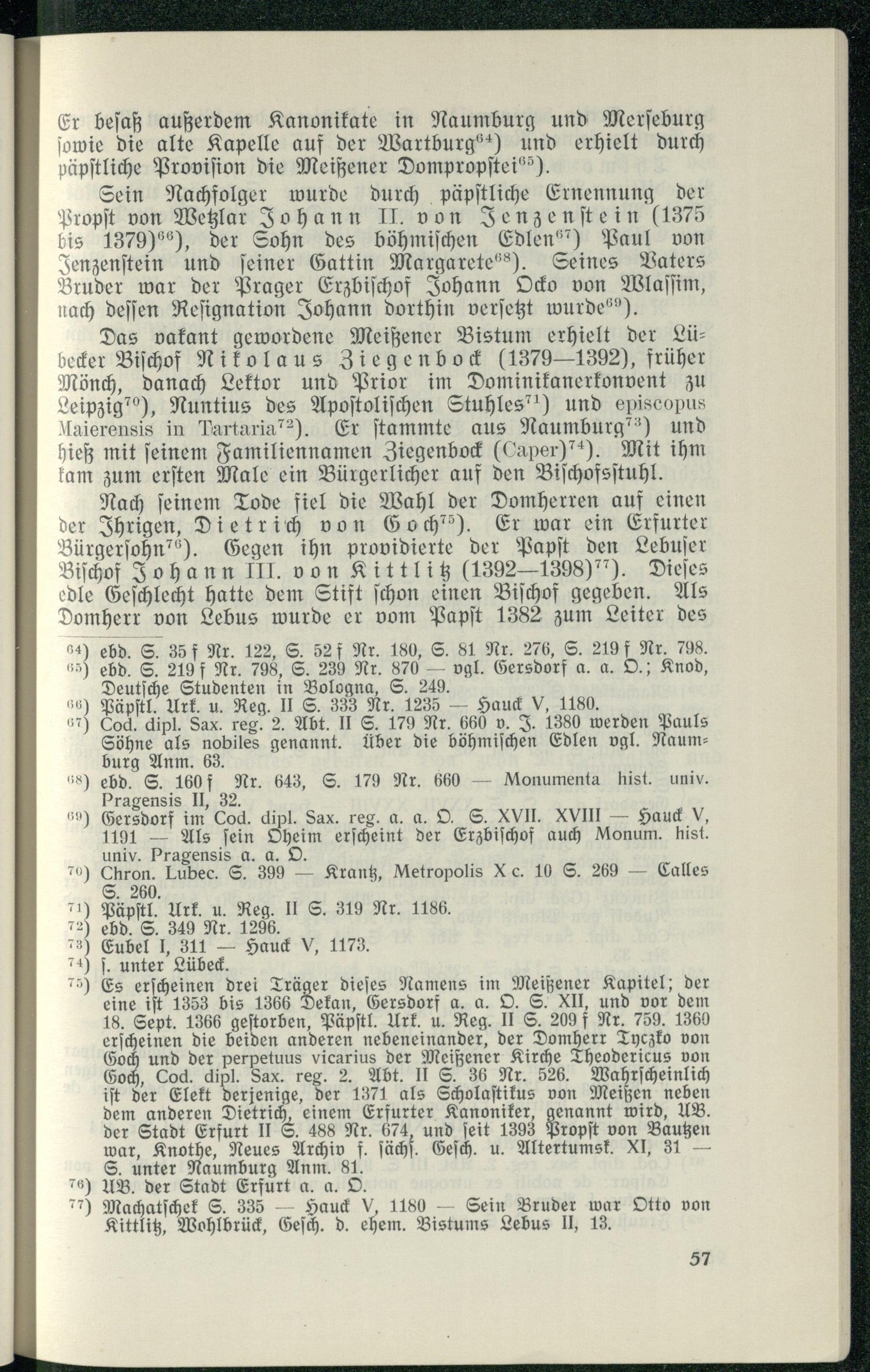 Sein Nachfolger wurde durch päpſtliche Ernennung der Propſt von Wetzlar Johann II. von Jenzen ſtein(1375 bis 1379) 3), der Sohn des böhmiſchen Edlen?!) Paul von Jenzenſtein und ſeiner Gattin Margaretess). Seines Vaters Bruder war der Prager Erzbiſchof Johann Ocko von Wlaſſim, nach deſſen Reſignation Johann dorthin verſetzt wurdess).