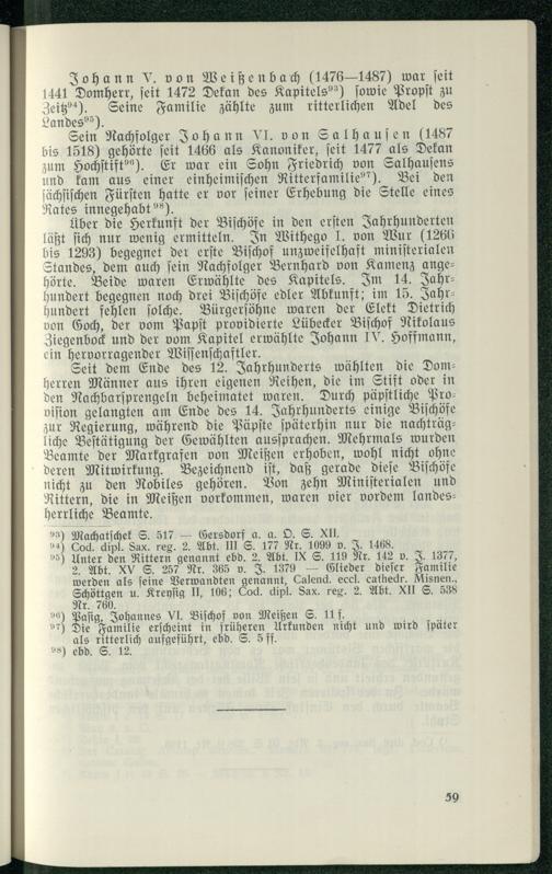 Sein Nachfolger Johann VI. von Salhauſen(1487 bis 1518) gehörte ſeit 1466 als Kanoniker, ſeit 1477 als Dekan zum Hochſtiftös). Er war ein Sohn Friedrich von Salhauſens und kam aus einer einheimiſchen Ritterfamilie''). Bei den ſächſiſchen Fürſten hatte er vor feiner Erhebung die Stelle eines Rates innegehabt??).