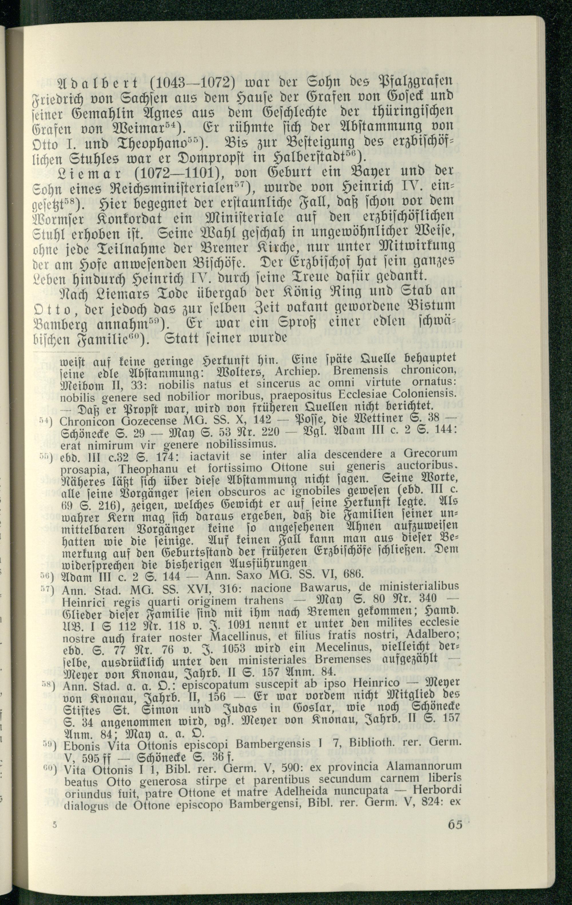 Adalbert (1043—1072) war der Sohn des Pfalzgrafen Friedrich von Sachſen aus dem Hauſe der Grafen von Goſeck und iner Gemahlin Agnes aus dem Geſchlechte der thüringiſchen Grafen von Weimarsc). Er rühmte ſich der Abſtammung von Otto J. und Theophanoss). Bis zur Beſteigung des erzbiſchöflichen Stuhles war er Dompropſt in Halberſtadt ?).