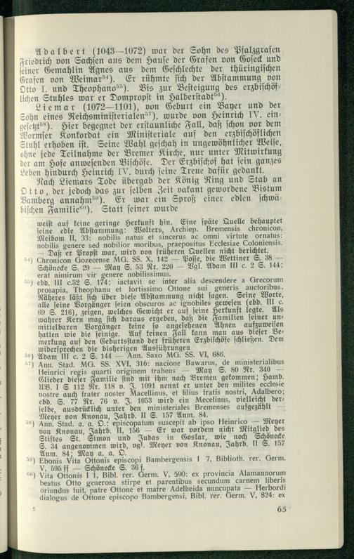 Ann. Stad. MG. SS. XVlI, 316: nacione Bawarus, de ministerialibus Heinrici regis quarti originem trahens— May S. 80 Nr. 340— Glieder dieſer Familie find mit ihm nach Bremen gekommen; Hamb. UB. IS 112 Rr. 118 v. J. 1091 nennt er unter den milites eceles ie nostre auch frater noster Macellinus, et filius fratis nostri, Adalbero; ebd. S. 77 Nr. 76 v. J. 1053 wird ein Mecelinus, vielleicht derſelbe, ausdrücklich unter den ministeriales Bremenses aufgezählt Meyer von Knonau , Jahrb. II S. 157 Anm. 84.