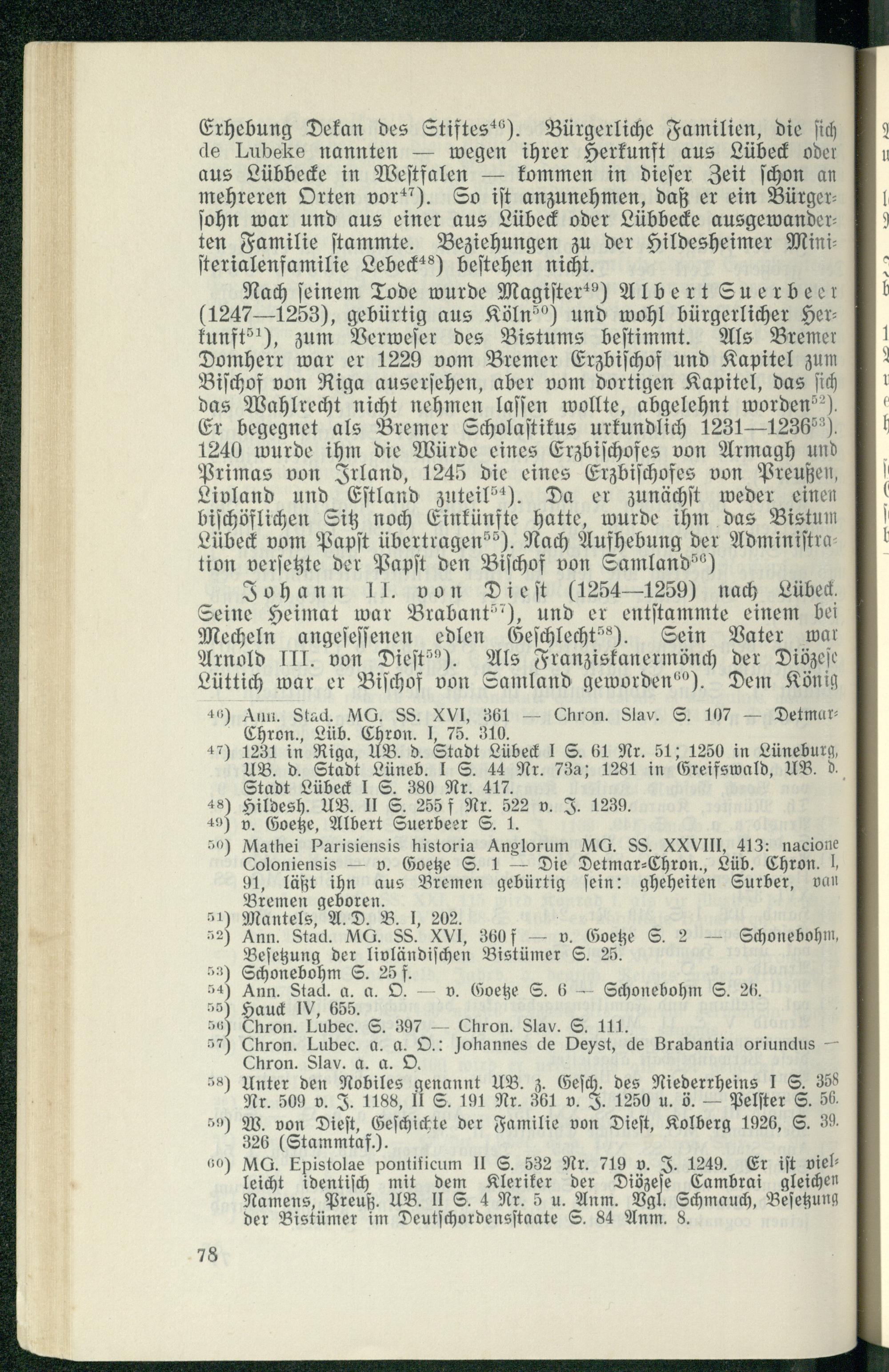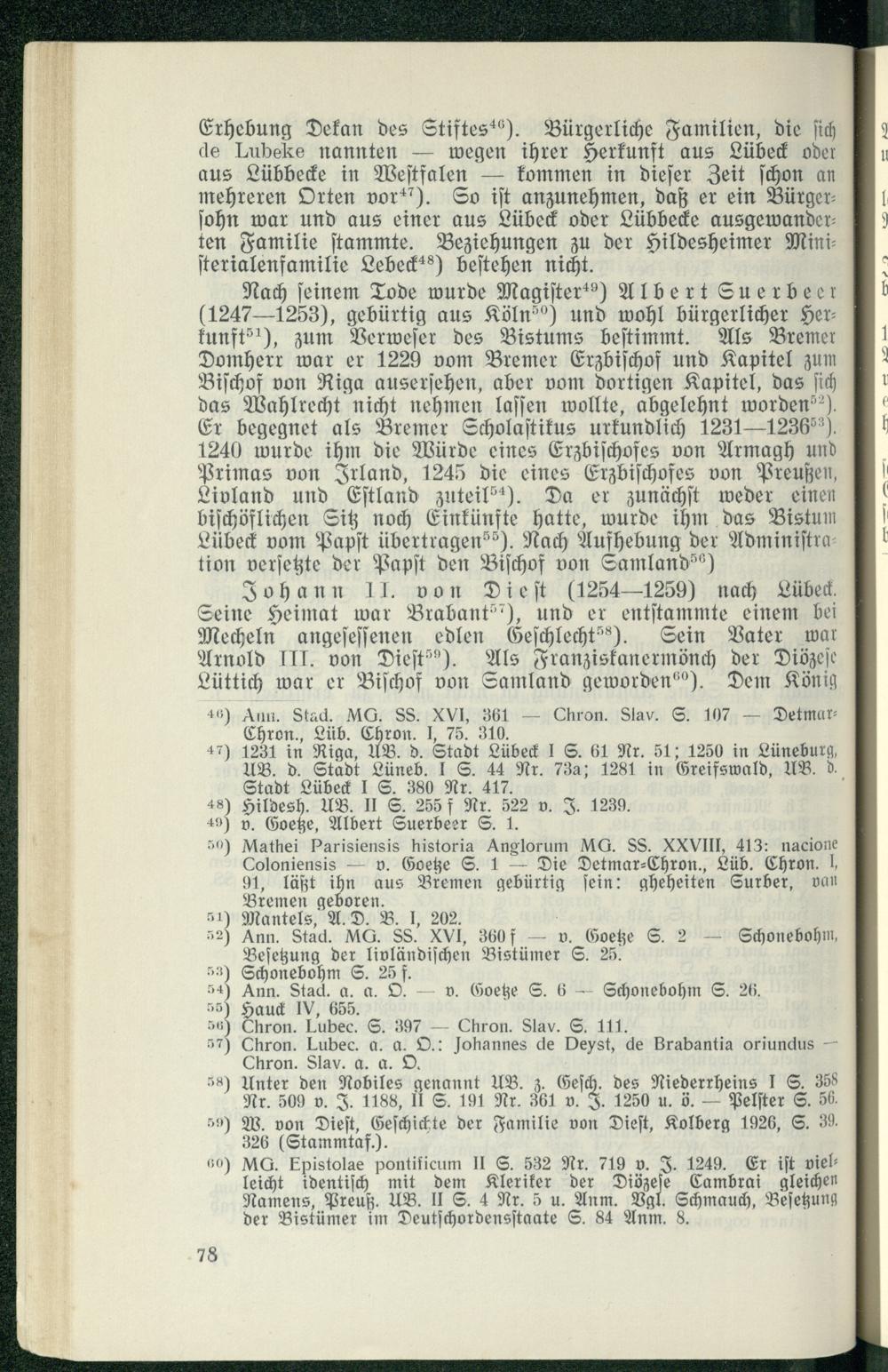 Nach ſeinem Tode wurde Magiſtert) Albert Suerbeer (1247— 1253), gebürtig aus Köln ”) und wohl bürgerlicher Herfunft°!), zum Verweſer des Bistums beſtimmt. Als Bremer Domherr war er 1229 vom Bremer Erzbiſchof und Kapitel zum Biſchof von Riga auserſehen, aber vom dortigen Kapitel, das ſich das Wahlrecht nicht nehmen laſſen wollte, abgelehnt worden?“) Er begegnet als Bremer Scholaſtikus urkundlich 1231—1236°°). 1240 wurde ihm die Würde eines Erzbiſchofes von Armagh und Primas von Irland , 1245 die eines Erzbiſchofes von Preußen, Livland und Eſtland zuteilst). Da er zunächſt weder einen biſchöflichen Sitz noch Einkünfte hatte, wurde ihm das Bistum Lübeck vom Papſt übertragenss). Nach Aufhebung der Adminiſtra— tion verſetzte der Papſt den Biſchof von Samlands«)