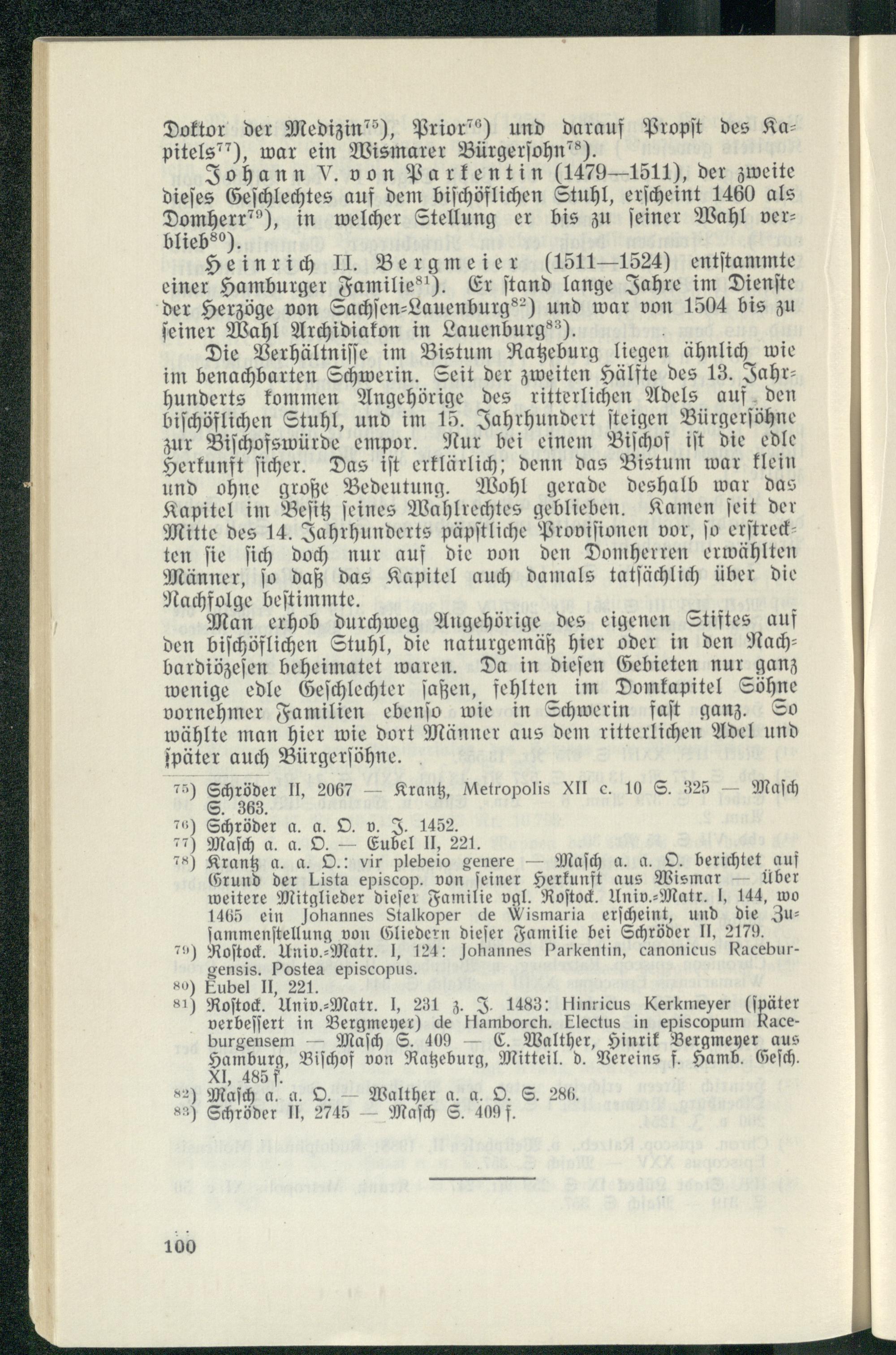 Krantz a. a. O.: vir plebejo genere— Maſch a. a. O. berichtet auf Grund der Lista episcop. von ſeiner Herkunft aus Wismar über weitere Mitglieder dieſer Familie vgl. Roſtock . Univ⸗Matr. I, 144, wo 1465 ein Johannes Stalkoper de Wismaria erſcheint, und die Zuſammenſtellung von Gliedern dieſer Familie bei Schröder II, 2179. Roſtock . Univ. Matr. J, 124: Johannes Parkentin , canonicus Raceburgensis. Postea episcopus.