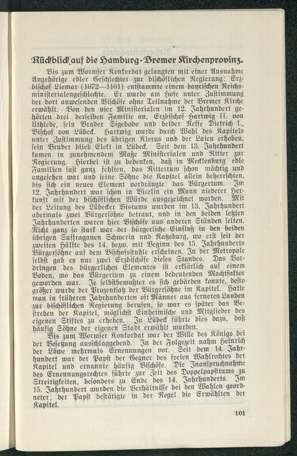 Bis zum Wormſer Konkordat gelangten mit einer Ausnahme Angehörige edler Geſchlechter zur biſchöflichen Regierung: Erz— biſchof Liemar (1072— 1101) entſtammte einem bayriſchen Reichs— miniſterialengeſchlechte. Er wurde am Hofe unter Zuſtimmung der dort anweſenden Biſchöfe ohne Teilnahme der Bremer Kirche erwählt. Von den vier Miniſterialen im 12. Jahrhundert gehörten drei derſelben Familie an, Erzbiſchof Hartwig II. von Uthlede , fein Bruder Sigebodo und beider Neffe Dietrich L, Biſchof von Lübeck . Hartwig wurde durch Wahl des Kapitels unter Zuſtimmung des übrigen Klerus und der Laien erhoben, ſein Bruder blieb Elekt in Lübeck . Seit dem 13. Jahrhundert kamen in zunehmendem Maße Miniſterialen und Ritter zur Regierung. Hierbei iſt zu bedenken, daß in Mecklenburg edle Familien faſt ganz fehlten, das Rittertum ſchon mächtig und angeſehen war und ſeine Söhne die Kapitel allein beherrſchten, bis ſich ein neues Element vordrängte: das Bürgertum. Im 12. Jahrhundert war ſchon in Vicelin ein Mann niederer Herkunft mit der biſchöflichen Würde ausgezeichnet worden. Mit der Leitung des Lübecker Bistums wurden im 13. Jahrhundert abermals zwei Bürgerſöhne betraut, und in den beiden letzten Jahrhunderten waren hier Biſchöfe aus anderen Ständen ſelten. Richt ganz ſo ſtark war der bürgerliche Einfluß in den beiden übrigen Suffraganen Schwerin und Ratzeburg , wo erſt ſeit der zweiten Hälfte des 14. bezw. mit Beginn des 15. Jahrhunderts Bürgerſöhne auf dem Biſchofsſtuhle erſcheinen. In der Metropole ſelbſt gab es nur zwei Erzbiſchöfe dieſes Standes. Das Vordringen des bürgerlichen Elementes iſt erklärlich auf einem Boden, wo das Bürgertum zu einem bedeutenden Machtfaktor geworden war. Je ſelbſtbewußter es ſich gebärden konnte, deſto größer wurde der Prozentſatz der Bürgerſshne im Kapitel. Hatte man in früheren Jahrhunderten oft Männer aus ferneren Landen zur biſchöflichen Regierung berufen, ſo war es ſpäter das Beſtreben der Kapitel, möglichſt Einheimiſche und Mitglieder des eigenen Stiftes zu erheben. In Lübeck führte dies dazu, daß häufig Söhne der eigenen Stadt erwählt wurden. ö;