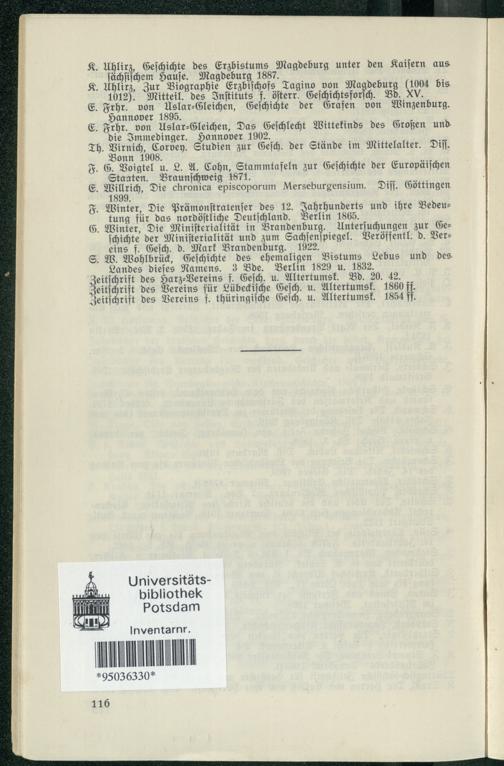 5. Winker, Die Miniſterialität in Brandenburg . Unterſuchungen zur Geſchichte der Miniſterialität und zum Sachſenſpiegel. Veröffentl. d. Vereins f. Geſch. d. Mark Brandenburg. 1922.;