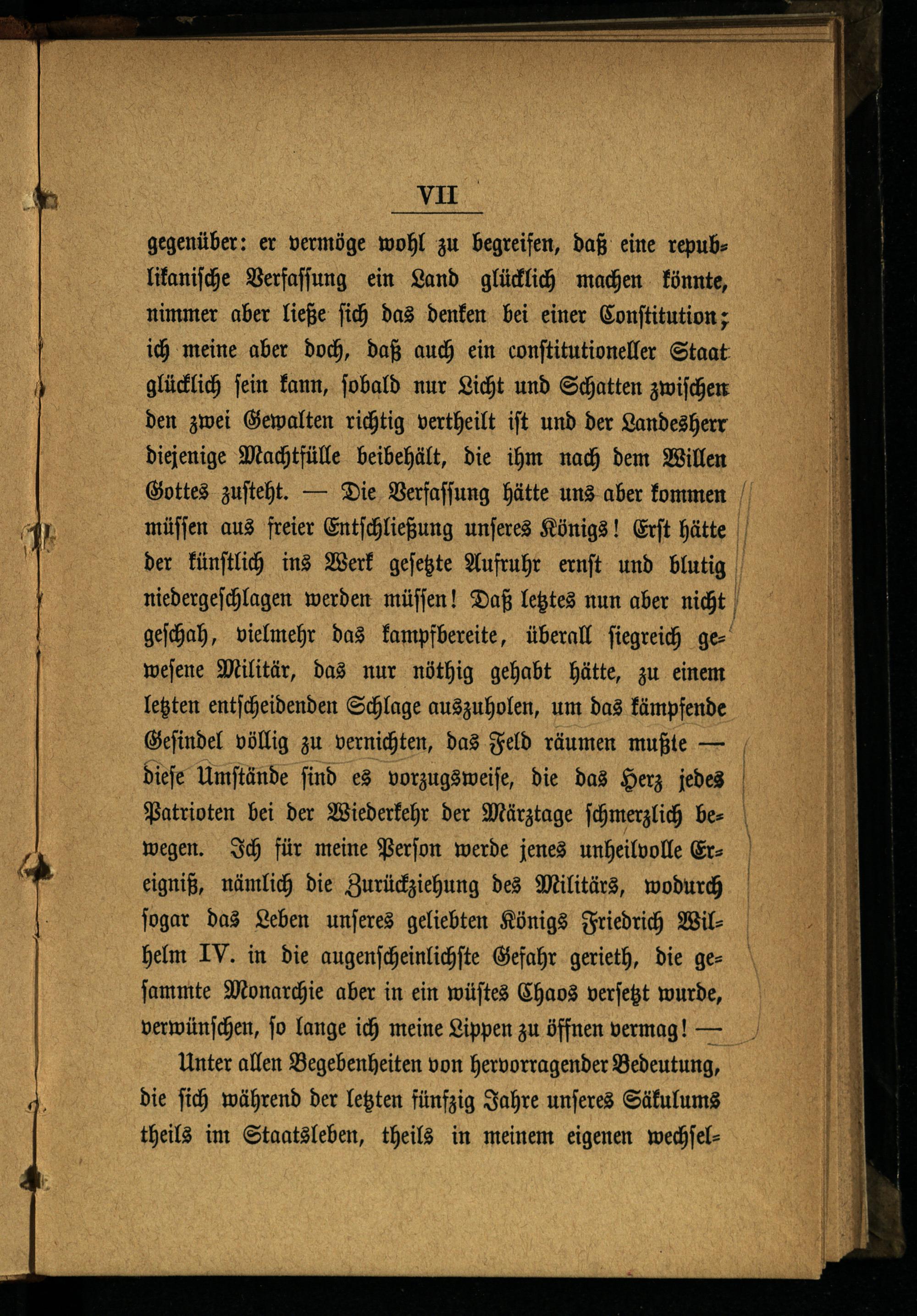 gegenüber: er vermöge wohl zu begreifen, daß eine republikaniſche Verfaſſung ein Land glücklich machen könnte, nimmer aber ließe ſich das denken bei einer Conſtitution; ich meine aber doch, daß auch ein conſtitutioneller Staat glücklich ſein kann, ſobald nur Licht und Schatten zwiſchen den zwei Gewalten richtig vertheilt iſt und der Landesherr diejenige Machtfülle beibehält, die ihm nach dem Willen