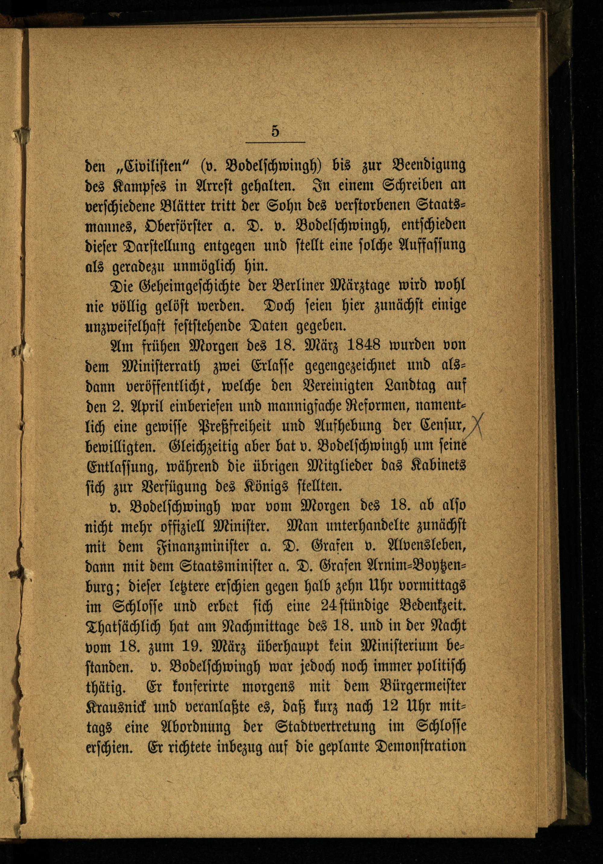 Am frühen Morgen des 18. März 1848 wurden von dem Miniſterrath zwei Erlaſſe gegengezeichnet und alsdann veröffentlicht, welche den Vereinigten Landtag auf den 2. April einberiefen und mannigfache Reformen, namentlich eine gewiſſe Preßfreiheit und Aufhebung der Cenſur, X bewilligten. Gleichzeitig aber bat v. Bodelſchwingh um ſeine Entlaſſung, während die übrigen Mitglieder das Kabinets ſich zur Verfügung des Königs ſtellten.