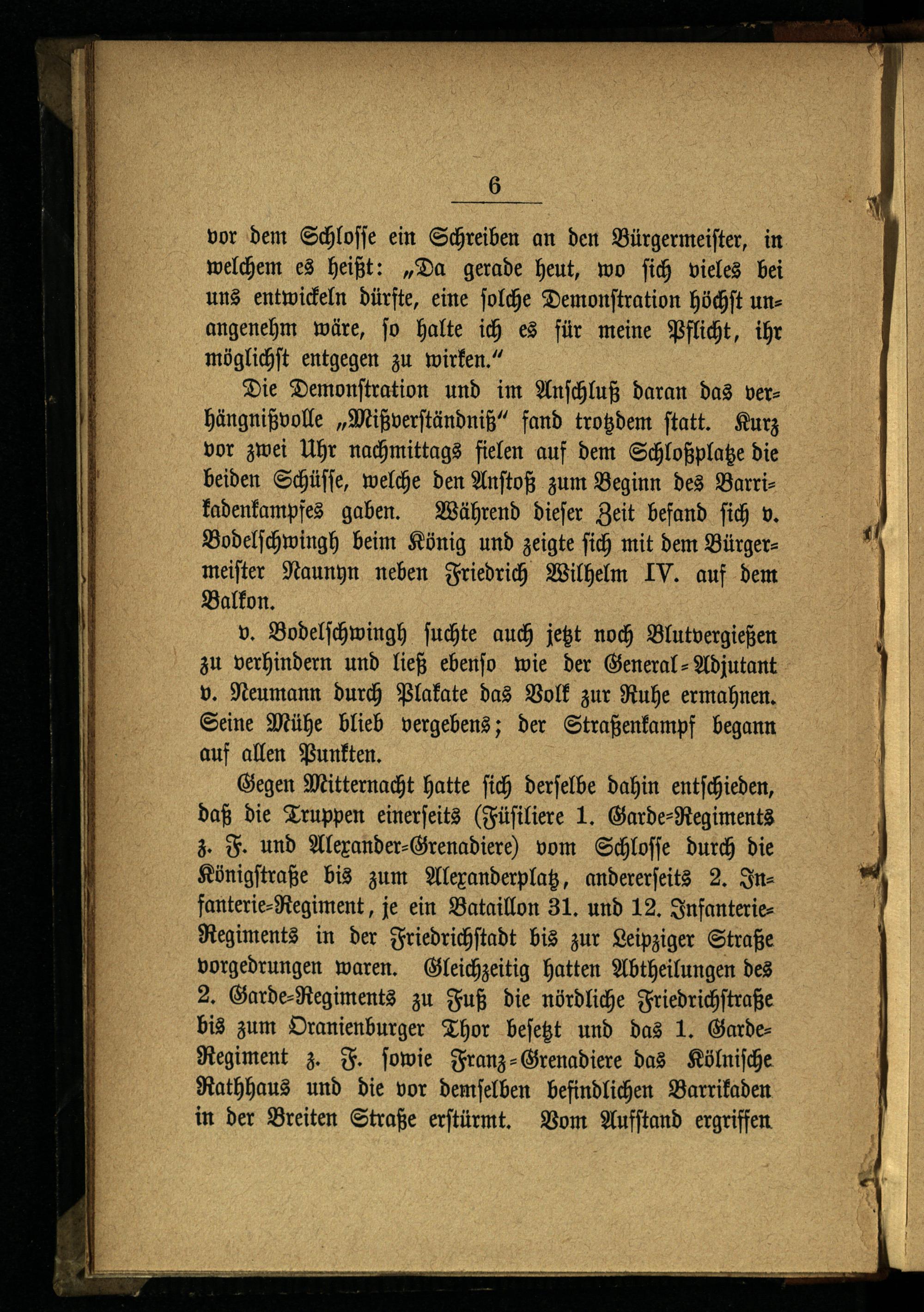 Die Demonſtration und im Anſchluß daran das verhängnißvolle„Mißverſtändniß“ fand trotzdem ſtatt. Kurz vor zwei Uhr nachmittags fielen auf dem Schloßplatze die beiden Schüſſe, welche den Anſtoß zum Beginn des Barri⸗| kadenkampfes gaben. Während dieſer Zeit befand ſich v. Bodelſchwingh beim König und zeigte ſich mit dem Bürgermeiſter Naunyn neben Friedrich Wilhelm IV. auf dem Balkon.
