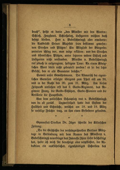 brach“, heißt es darin„den Miniſter mit den Worten: Schloß, Zeughaus, Schloßplatz, Luſtgarten müßten doch beſetzt bleiben. Herr v. Bodelſchwingh aber erwiderte: die Ausdrücke Seiner Majeſtät ſeien beſtimmt geweſen: von Straßen und Plätzen! Ein Mitglied der Bürgerdeputation ſchlug vor, man möge erklären: von den Straßen und öffentlichen Plätzen, unter letzteren wären Schloß und Luſtgarten nicht verſtanden. Miniſter v. Bodelſchwingh rief jedoch in aufgeregtem, heftigem Tone: An einem Königlichen Wort dürfe nicht gedeutelt werden! es ſei der letzte Befehl, den er als Beamteter brächte.“