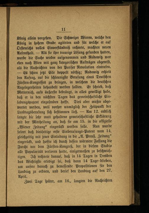 König allein vorgehen. Die Schweizer Wirren, welche den König in hohem Grade agitirten und für welche er auf Oeſtereichs volles Einverſtändniß rechnete, machten neuen Aufenthalt.— Als ſie ihre traurige Löſung gefunden hatten, wurde die Sache wieder aufgenommen und Radowitz war eben nach Wien mit ganz kategoriſchen Aufträgen abgereiſt, als die Nachrichten von der Pariſer Revolution eintrafen. — Es ſchien jetzt Eile doppelt nöthig; Radowitz erhielt den Aufrag, auf die ſchleunigſte Berufung eines Deutſchen Fürſten⸗Kongreſſes zu dringen, in welchem die deutſchen Angelegenheiten behandelt werden ſollten. Er ſchrieb, daß Metternich, aufs äußerſte bedrängt, in alles gewilligt habe, daß er in den nächſten Tagen das gemeinſchaftliche Einladungspatent einzuſenden hoffe. Dies aber mußte abgewartet werden, weil vorher unmöglich der Zeitpunkt der Landtagsberufung ſich beſtimmen ließ.— Am 12. endlich langte die ſehr matt gehaltene gemeinſchaftliche Erklärung mit der Mittheilung an, daß fie am 15. in die offizielle „Wiener Zeitung“ eingerückt werden ſolle. Nun wurde ſofort daß diesſeitige erſte Einberufungs-Patent vom 14. gleichzeitig mit jener Einladung in die„A. Preuß. Zeitung! eingerückt, und hoffte ich durch deſſen wärmere Faſſung die Furcht vor dem Fürſten⸗Kongreß, der in dieſem Stadio alle Popularität verloren hatte, einigermaßen zu beſchwichtigen. Ich rechnete darauf, daß in 14 Tagen in Dresden das Wichtigſte erledigt ſei, daß dann 14 Tage blieben, um unſere danach zu bemeſſende Propoſitionen für den Landtag zu ordnen, und berief den Landtag auf den 27. April.