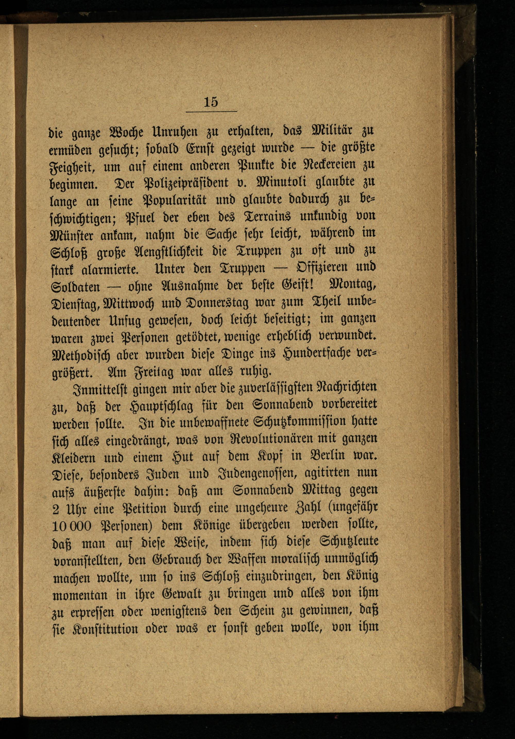 Inmittelſt gingen mir aber die zuverläſſigſten Nachrichten zu, daß der Hauptſchlag für den Sonnabend vorbereitet werden ſollte. In die unbewaffnete Schutzkommiſſion hatte ſich alles eingedrängt, was von Revolutionären mit ganzen Kleidern und einem Hut auf dem Kopf in Berlin war. Dieſe, beſonders Juden und Judengenoſſen, agitirten nun aufs äußerſte dahin: daß am Sonnabend Mittag gegen 2 Uhr eine Petition durch eine ungeheure Zahl(ungefähr 10 000 Perſonen) dem Könige übergeben werden ſollte, daß man auf dieſe Weiſe, indem ſich dieſe Schutzleute voranſtellten, den Gebrauch der Waffen moraliſch unmöglich machen wollte, um ſo ins Schloß einzudringen, den König momentan in ihre Gewalt zu bringen und alles von ihm zu erpreſſen oder wenigſtens den Schein zu gewinnen, daß fie Konſtitution oder was er ſonſt geben wolle, von ihm