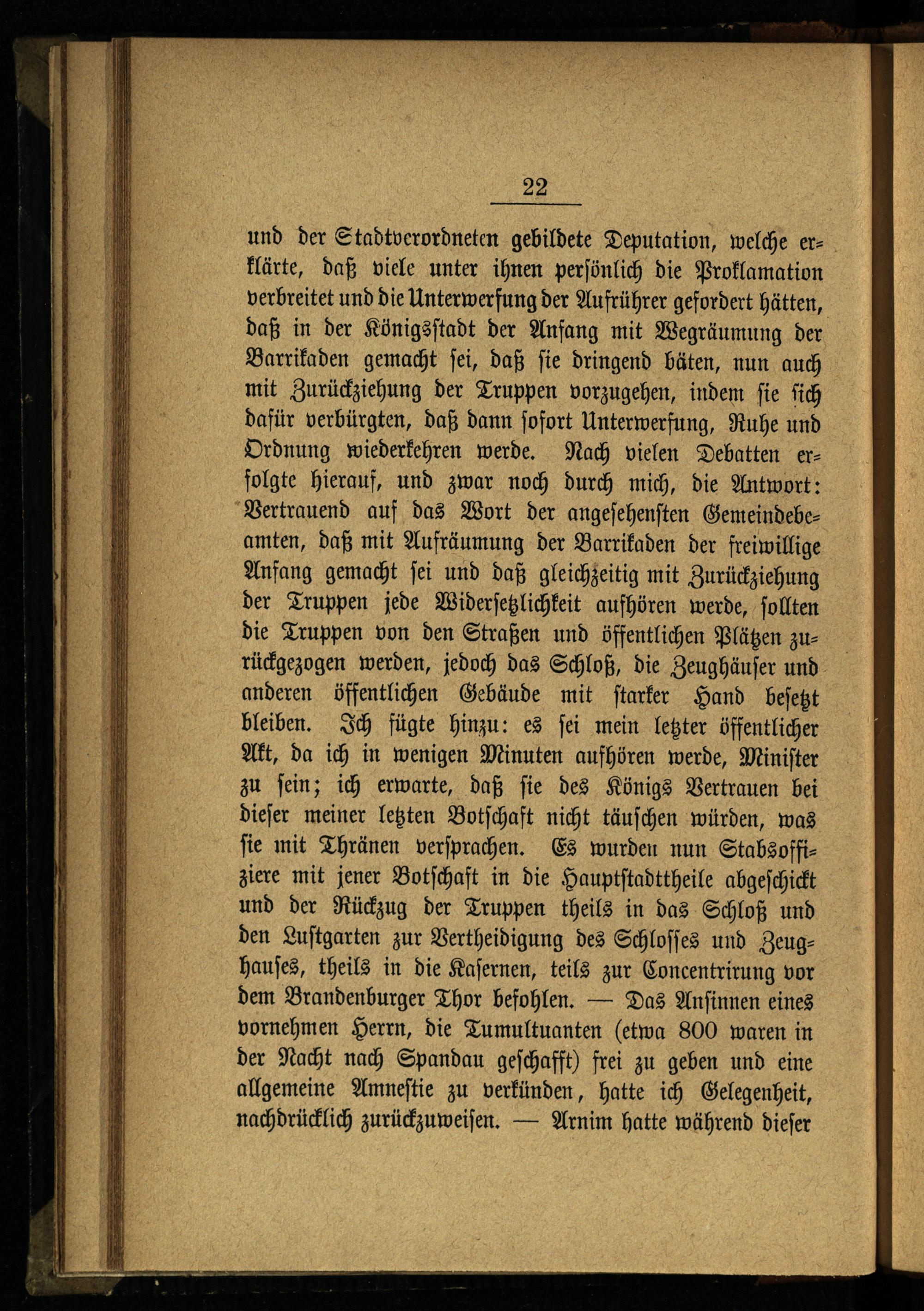 und der Stadtverordneten gebildete Deputation, welche erklärte, daß viele unter ihnen perſönlich die Proklamation verbreitet und die Unterwerfung der Aufrührer gefordert hätten, a daß in der Königsſtadt der Anfang mit Wegräumung der Barrikaden gemacht ſei, daß ſie dringend bäten, nun auch mit Zurückziehung der Truppen vorzugehen, indem ſie ſich dafür verbürgten, daß dann ſofort Unterwerfung, Ruhe und Ordnung wiederkehren werde. Nach vielen Debatten erfolgte hierauf, und zwar noch durch mich, die Antwort: Vertrauend auf das Wort der angeſehenſten Gemeindebeamten, daß mit Aufräumung der Barrikaden der freiwillige Anfang gemacht ſei und daß gleichzeitig mit Zurückziehung der Truppen jede Widerſetzlichkeit aufhören werde, ſollten die Truppen von den Straßen und öffentlichen Plätzen zurückgezogen werden, jedoch das Schloß, die Zeughäuſer und anderen öffentlichen Gebäude mit ſtarker Hand beſetzt bleiben. Ich fügte hinzu: es ſei mein letzter öffentlicher Akt, da ich in wenigen Minuten aufhören werde, Miniſter zu ſein; ich erwarte, daß ſie des Königs Vertrauen bei dieſer meiner letzten Botſchaft nicht täuſchen würden, was ſie mit Thränen verſprachen. Es wurden nun Stabsoffiziere mit jener Botſchaft in die Hauptſtadttheile abgeſchickt und der Rückzug der Truppen theils in das Schloß und den Luſtgarten zur Vertheidigung des Schloſſes und Zeughauſes, theils in die Kaſernen, teils zur Concentrirung vor dem Brandenburger Thor befohlen.— Das Anſinnen eines vornehmen Herrn, die Tumultuanten(etwa 800 waren in der Nacht nach Spandau geſchafft) frei zu geben und eine allgemeine Amneſtie zu verkünden, hatte ich Gelegenheit, nachdrücklich zurückzuweiſen.— Arnim hatte während dieſer