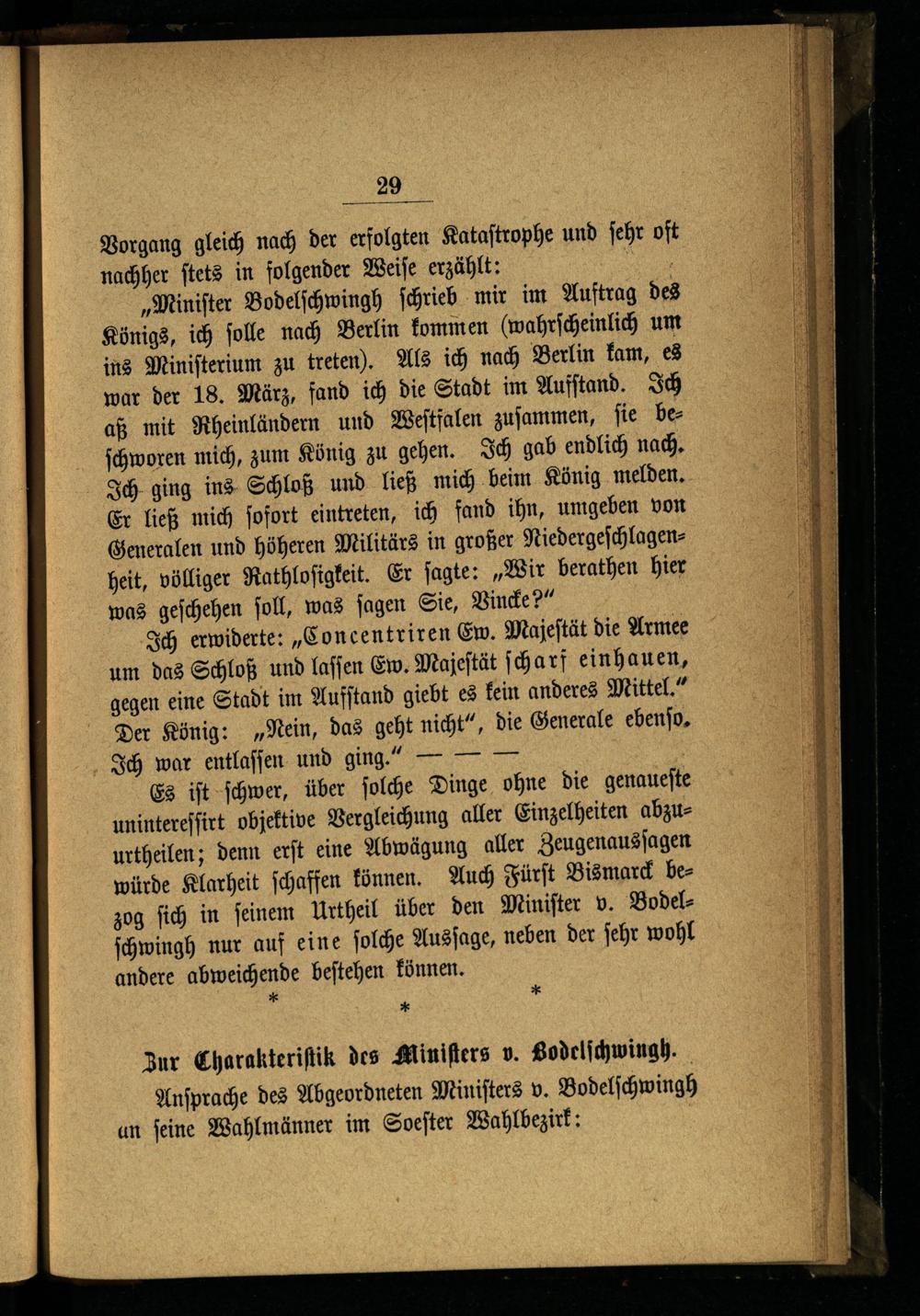 „Miniſter Bodelſchwingh ſchrieb mir im Auftrag des Königs, ich ſolle nach Berlin kommen(wahrſcheinlich um ins Miniſterium zu treten). Als ich nach Berlin kam, es war der 18. März, fand ich die Stadt im Aufſtand. Ich aß mit Rheinländern und Weſtfalen zuſammen, ſie beſchworen mich, zum König zu gehen. Ich gab endlich nach. Ich ging ins Schloß und ließ mich beim König melden. Er ließ mich ſofort eintreten, ich fand ihn, umgeben von Generalen und höheren Militärs in großer Niedergeſchlagenheit, völliger Rathloſigkeit. Er ſagte:„Wir berathen hier was geſchehen ſoll, was ſagen Sie, Vincke?“