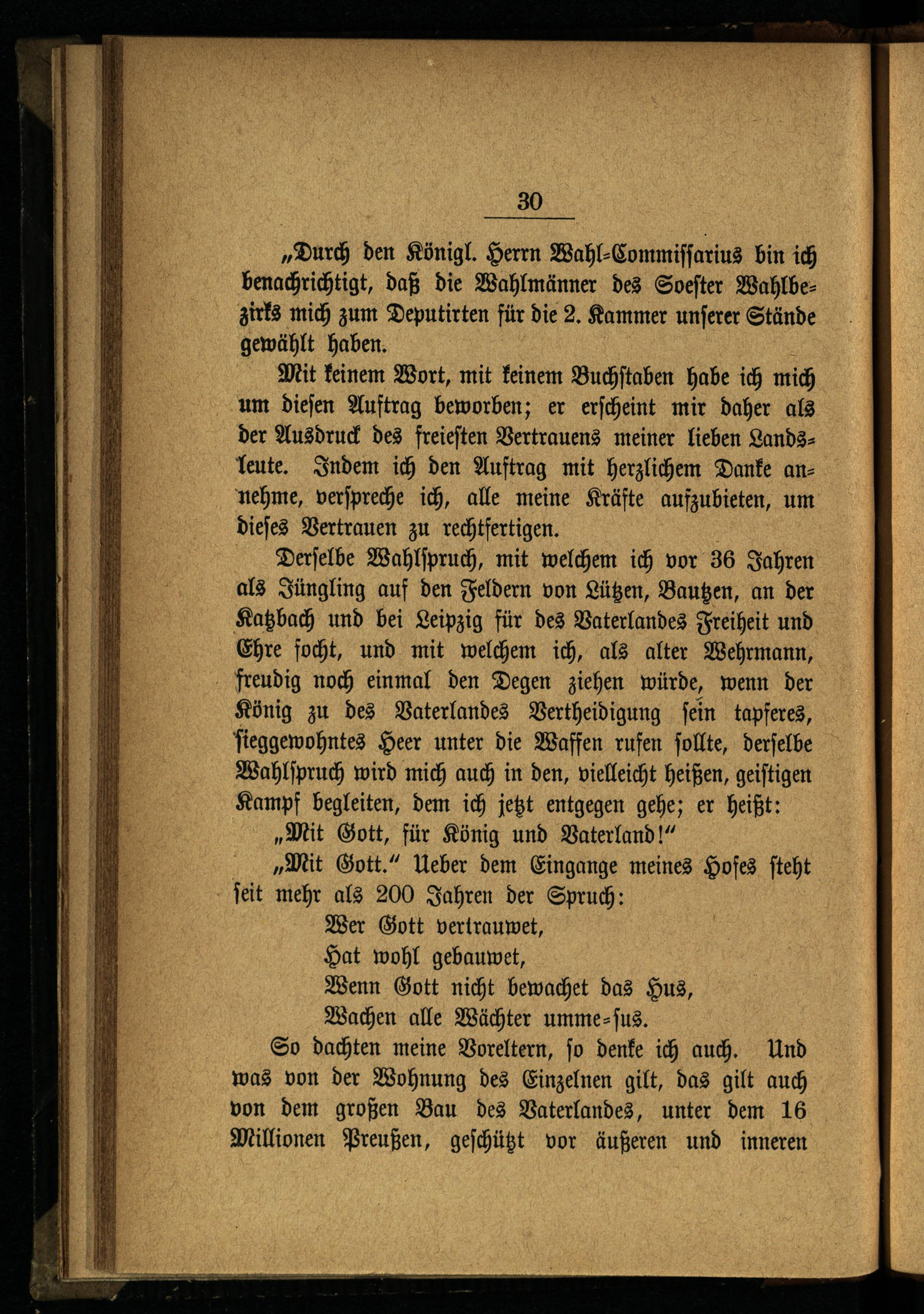 Derſelbe Wahlſpruch, mit welchem ich vor 36 Jahren als Jüngling auf den Feldern von Lützen, Bautzen, an der Katzbach und bei Leipzig für des Vaterlandes Freiheit und Ehre focht, und mit welchem ich, als alter Wehrmann, freudig noch einmal den Degen ziehen würde, wenn der König zu des Vaterlandes Vertheidigung ſein tapferes, ſieggewohntes Heer unter die Waffen rufen ſollte, derſelbe Wahlſpruch wird mich auch in den, vielleicht heißen, geiſtigen Kampf begleiten, dem ich jetzt entgegen gehe; er heißt: „Mit Gott, für König und Vaterland!“