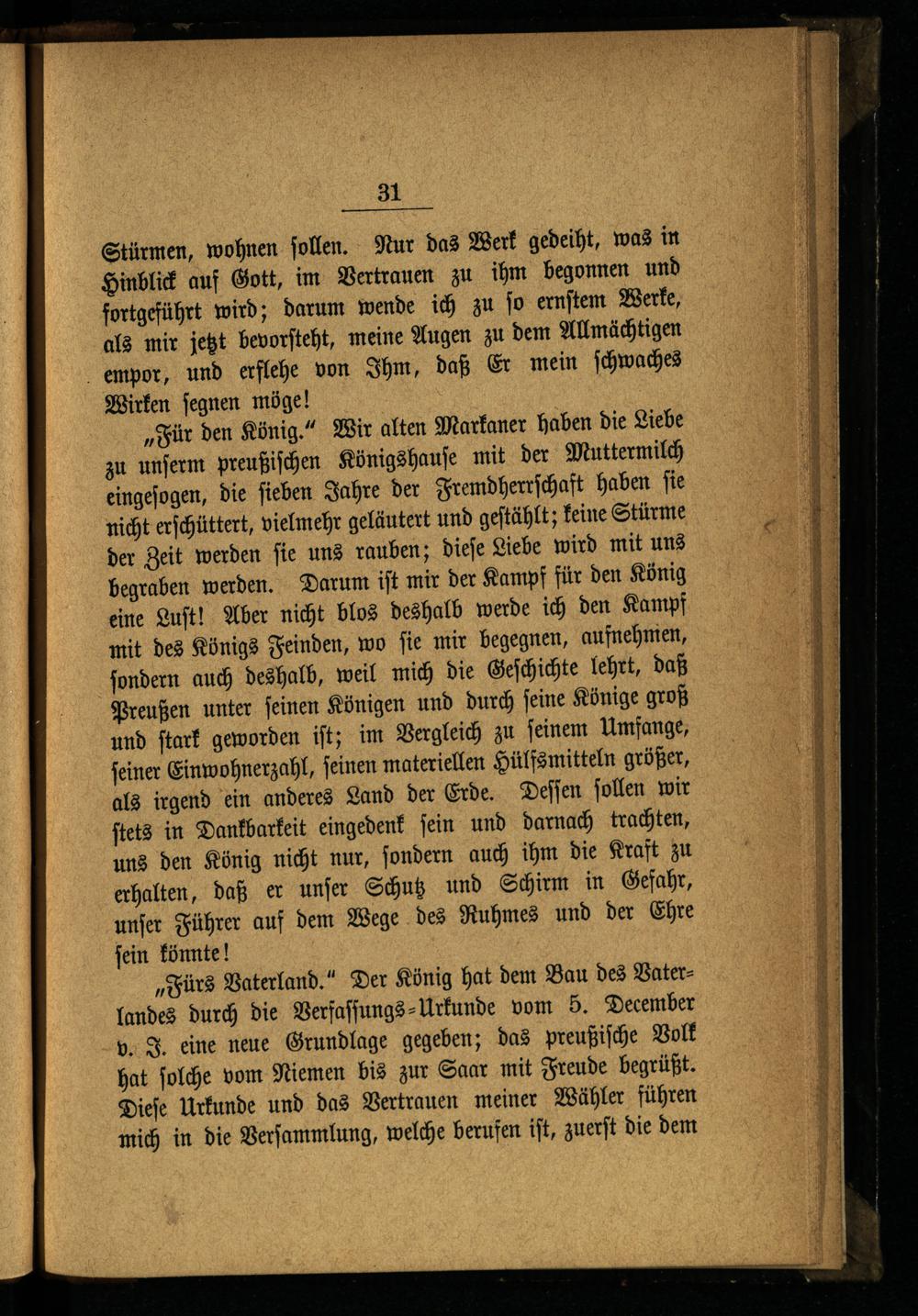 „Für den König.“ Wir alten Markaner haben die Liebe zu unſerm preußiſchen Königshauſe mit der Muttermilch eingeſogen, die ſieben Jahre der Fremdherrſchaft haben ſie nicht erſchüttert, vielmehr geläutert und geſtählt; keine Stürme der Zeit werden ſie uns rauben; dieſe Liebe wird mit uns begraben werden. Darum iſt mir der Kampf für den König eine Luſt! Aber nicht blos deshalb werde ich den Kampf mit des Königs Feinden, wo ſie mir begegnen, aufnehmen, ſondern auch deshalb, weil mich die Geſchichte lehrt, daß Preußen unter ſeinen Königen und durch ſeine Könige groß und ſtark geworden iſt; im Vergleich zu ſeinem Umfange, ſeiner Einwohnerzahl, ſeinen materiellen Hülfsmitteln größer, als irgend ein anderes Land der Erde. Deſſen ſollen wir ſtets in Dankbarkeit eingedenk ſein und darnach trachten, uns den König nicht nur, ſondern auch ihm die Kraft zu erhalten, daß er unſer Schutz und Schirm in Gefahr, unſer Führer auf dem Wege des Ruhmes und der Ehre ſein könnte!