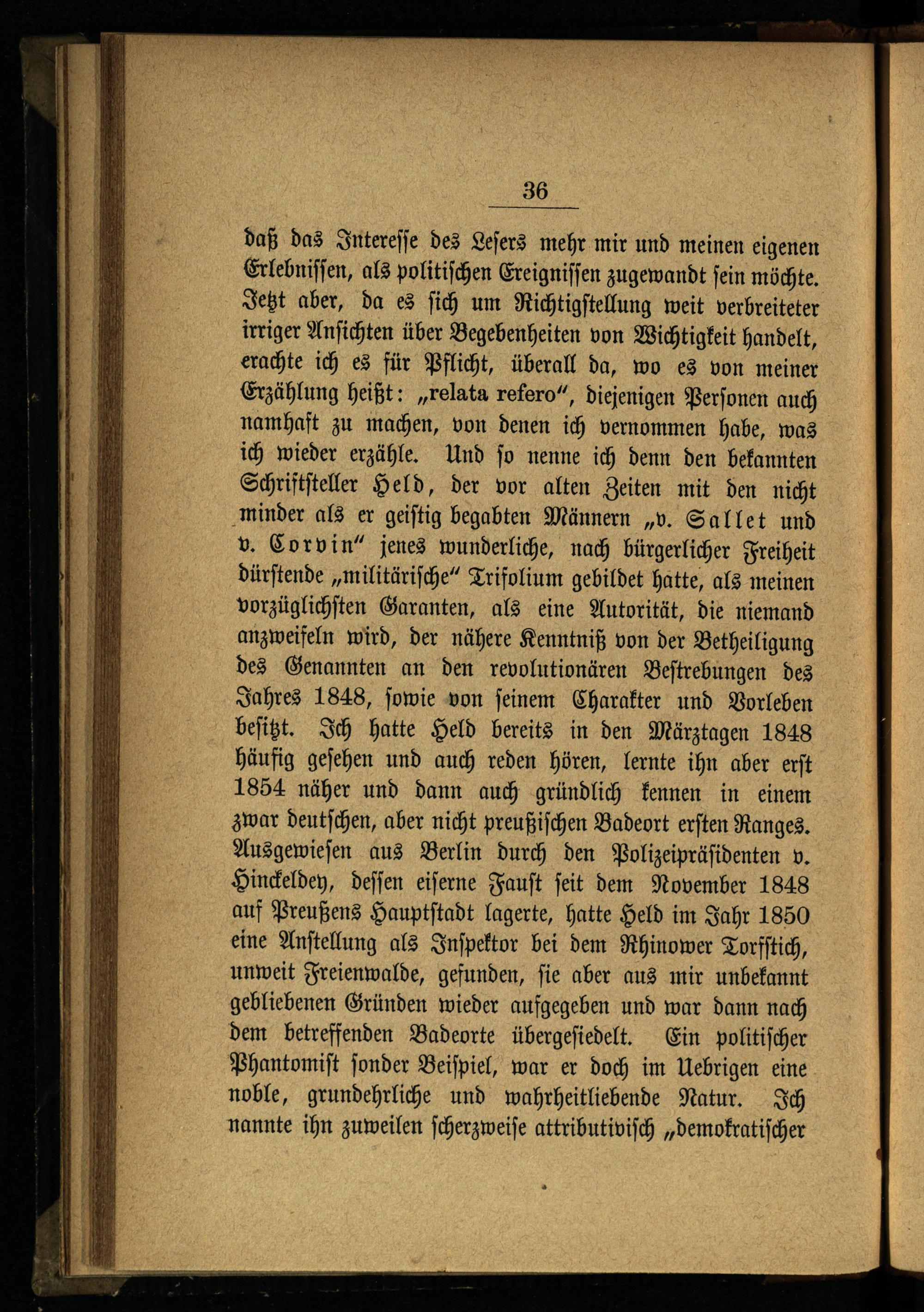 daß das Intereſſe des Leſers mehr mir und meinen eigenen Erlebniſſen, als politiſchen Ereigniſſen zugewandt ſein möchte. Jetzt aber, da es ſich um Richtigſtellung weit verbreiteter irriger Anſichten über Begebenheiten von Wichtigkeit handelt, erachte ich es für Pflicht, überall da, wo es von meiner Erzählung heißt:„relata refero“, diejenigen Perſonen auch namhaft zu machen, von denen ich vernommen habe, was ich wieder erzähle. Und ſo nenne ich denn den bekannten Schriftſteller Held, der vor alten Zeiten mit den nicht minder als er geiſtig begabten Männern„v. Sallet und v. Corvin“ jenes wunderliche, nach bürgerlicher Freiheit dürſtende„militäriſche“ Trifolium gebildet hatte, als meinen vorzüglichſten Garanten, als eine Autorität, die niemand anzweifeln wird, der nähere Kenntniß von der Betheiligung des Genannten an den revolutionären Beſtrebungen des Jahres 1848, ſowie von ſeinem Charakter und Vorleben beſitzt. Ich hatte Held bereits in den Märztagen 1848 häufig geſehen und auch reden hören, lernte ihn aber erſt 1854 näher und dann auch gründlich kennen in einem zwar deutſchen, aber nicht preußiſchen Badeort erſten Ranges. Ausgewieſen aus Berlin durch den Polizeipräſidenten v. Hinckeldey, deſſen eiſerne Fauſt ſeit dem November 1848 auf Preußens Hauptſtadt lagerte, hatte Held im Jahr 1850 eine Anſtellung als Inſpektor bei dem Rhinower Torfſtich, unweit Freienwalde, gefunden, ſie aber aus mir unbekannt gebliebenen Gründen wieder aufgegeben und war dann nach dem betreffenden Badeorte übergeſiedelt. Ein politiſcher Phantomiſt ſonder Beiſpiel, war er doch im Uebrigen eine noble, grundehrliche und wahrheitliebende Natur. Ich nannte ihn zuweilen ſcherzweiſe attributiviſch„demokratiſcher