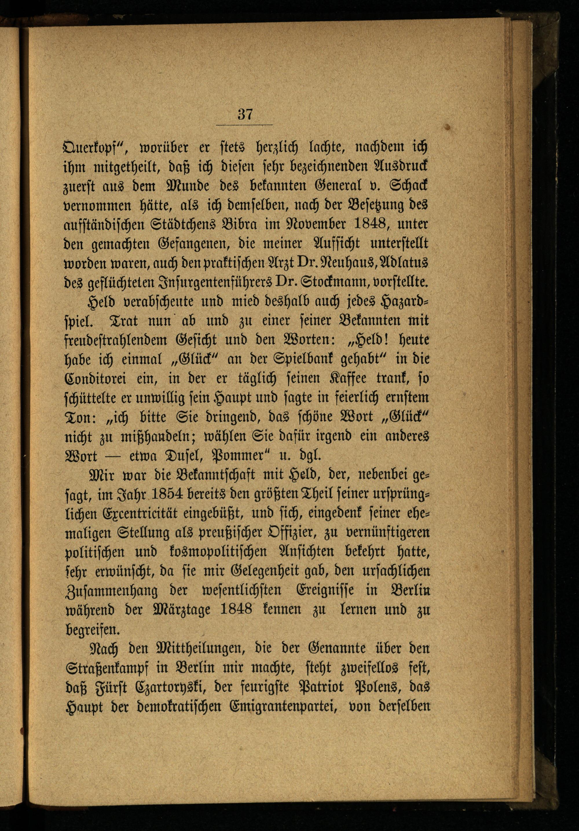 Mir war die Bekanntſchaft mit Held, der, nebenbei geſagt, im Jahr 1854 bereits den größten Theil ſeiner urſprünglichen Excentricität eingebüßt, und ſich, eingedenk ſeiner ehemaligen Stellung als preußiſcher Offizier, zu vernünftigeren politiſchen und kosmopolitiſchen Anſichten bekehrt hatte, ſehr erwünſcht, da ſie mir Gelegenheit gab, den urſachlichen Zuſammenhang der weſentlichſten Ereigniſſe in Berlin während der Märztage 1848 kennen zu lernen und zu begreifen.